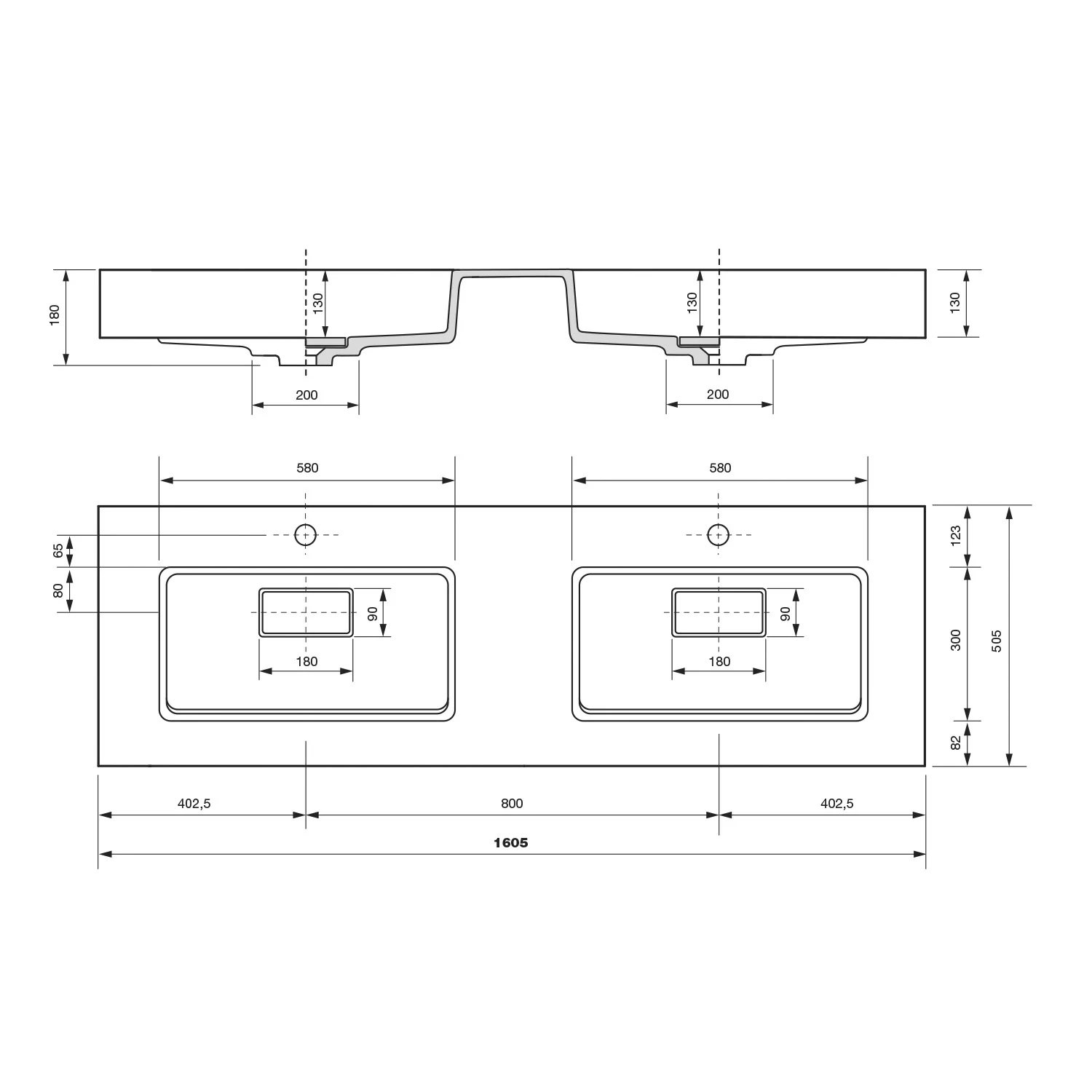 ALLUVION Eros Doppel-Waschtisch 160 cm, ohne Hahnloch