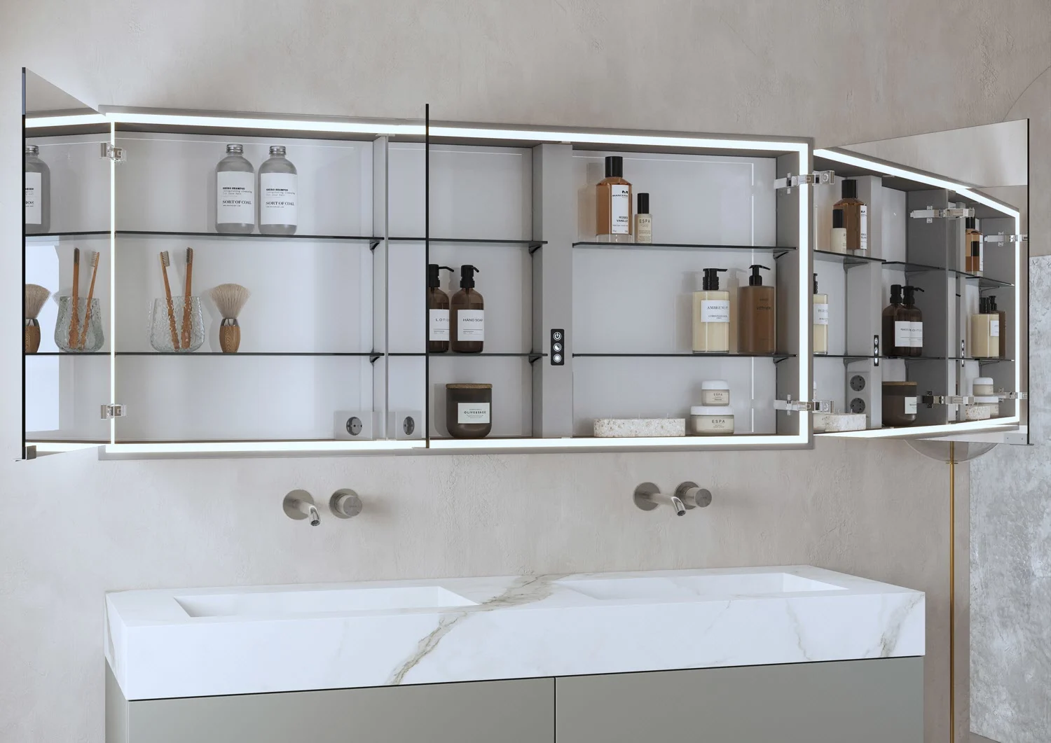 - 3 Steckdosen im Spiegelschrankinneren ermöglicht die Nutzung eines Föhns oder das Aufladen einer Zahnbürste.