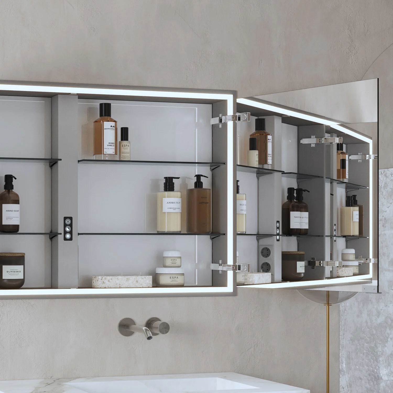 - Eine Doppelsteckdose im Spiegelschrankinneren ermöglicht die Nutzung eines Föhns oder das Aufladen einer Zahnbürste.
