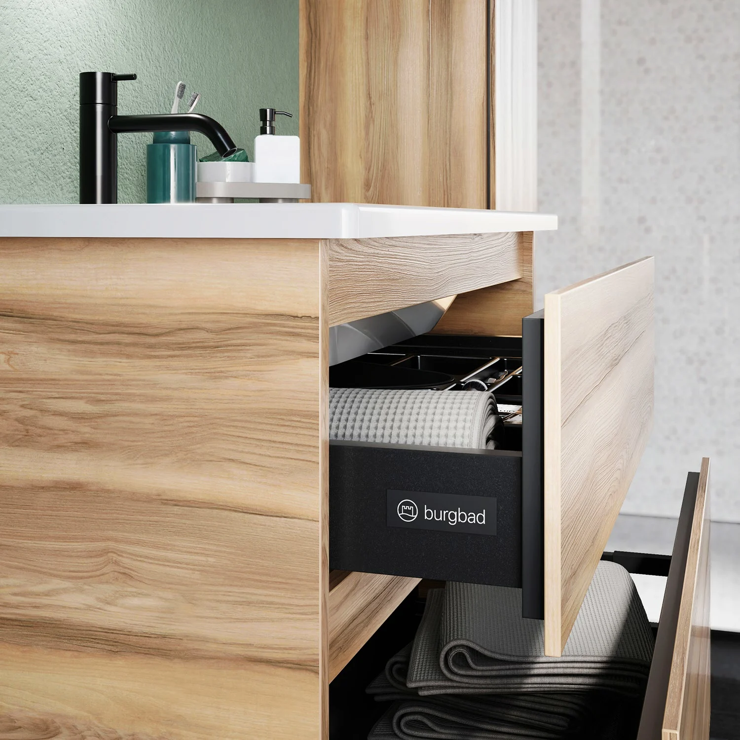 - Vollauszüge mit geräuscharmem Selbsteinzugsmechanismus und Anschlagdämpfung (Silent System)