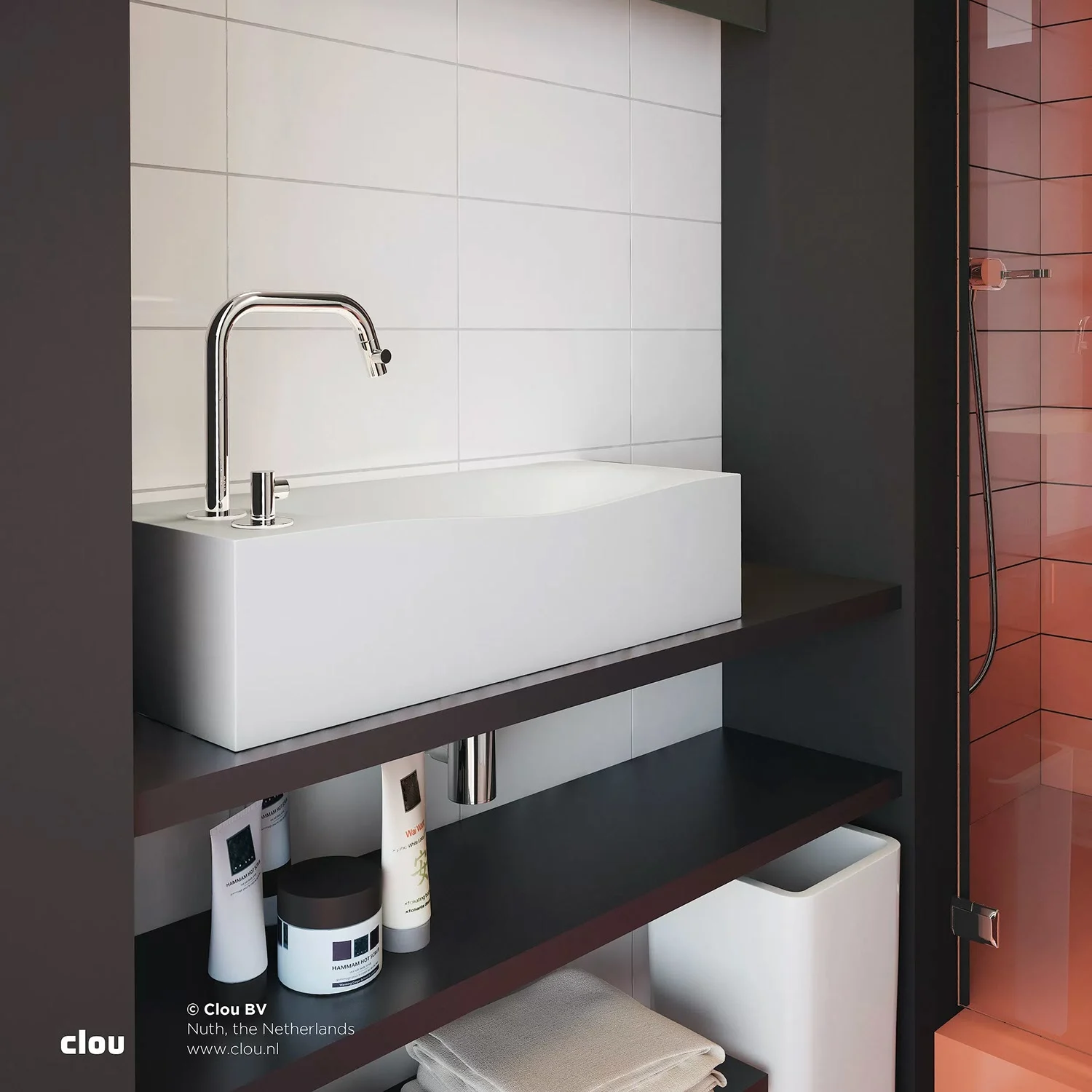 Bei Aluite (Solid Surface) handelt es sich um einen Verbundwerkstoff, den wir aufgrund seines Soft-Touch-Effekts und seiner Schönheit für unsere Produkte ausgewählt haben. Außer seiner ästhetischen Qualität ist dieses Material anderen Werkstoffen, die in Badezimmern eingesetzt werden, technisch deutlich überlegen. Während andere Materialien, die häufig in diesem Bereich eingesetzt werden, schnell verkratzen und dauerhaft beschädigt werden, ist dieser Stoff im ganzen Produkt einheitlich: Dadurch lassen sich Kratzer mit einem Schwamm und im Fachgeschäft erhältlichen Scheuermitteln beseitigen. Darüber hinaus ist dieses Material UV-stabilisiert. Aluite ist ein technisch avancierter Verbundwerkstoff, der einen hohen Anteil natürlicher Mineralstoffe sowie einen geringen Anteil an Harzen enthält. Durch dieses Material ist es möglich, Produkte in matt weißer Farbe herzustellen, die zudem ein besonders geradliniges Design mit sehr scharfen Rändern und Ecken aufweisen. Wenn Aluite regelmäßig gereinigt wird, behält es sein ursprüngliches attraktives Aussehen. Außerdem werden Abnutzungserscheinungen, die im Laufe der Zeit entstehen, vermindert. Wartungsanweisungen können Sie auf der Website des Herstellers finden: www.clou.nl.