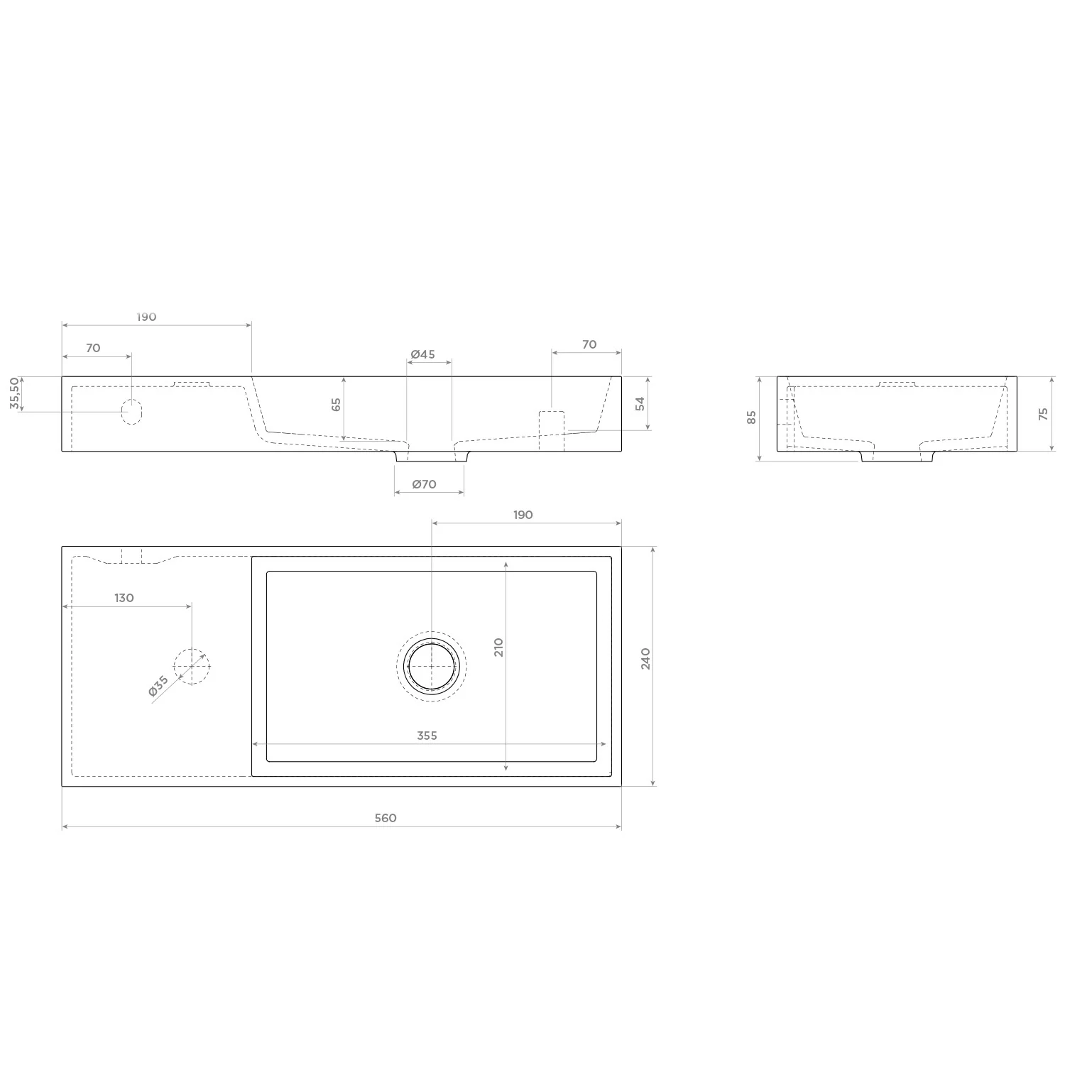 Clou Mini Wash Me Plus Left Aluite - Handwaschbecken 56 cm ohne Hahnloch