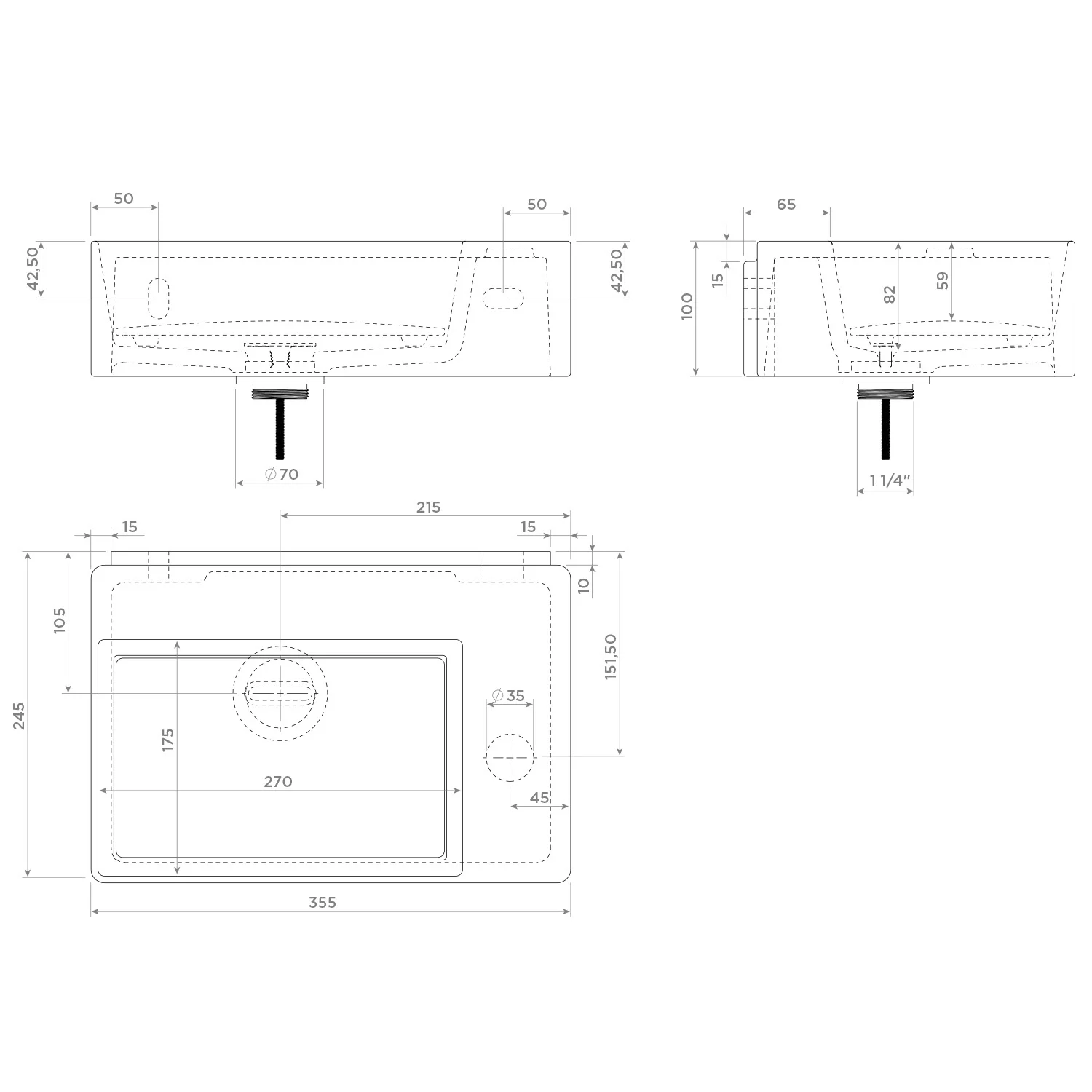 Clou New Flush 2 Aluite-Handwaschbecken 35,5 x 24,5 cm mit vorgestochenem Hahnloch rechts und Ablaufplatte