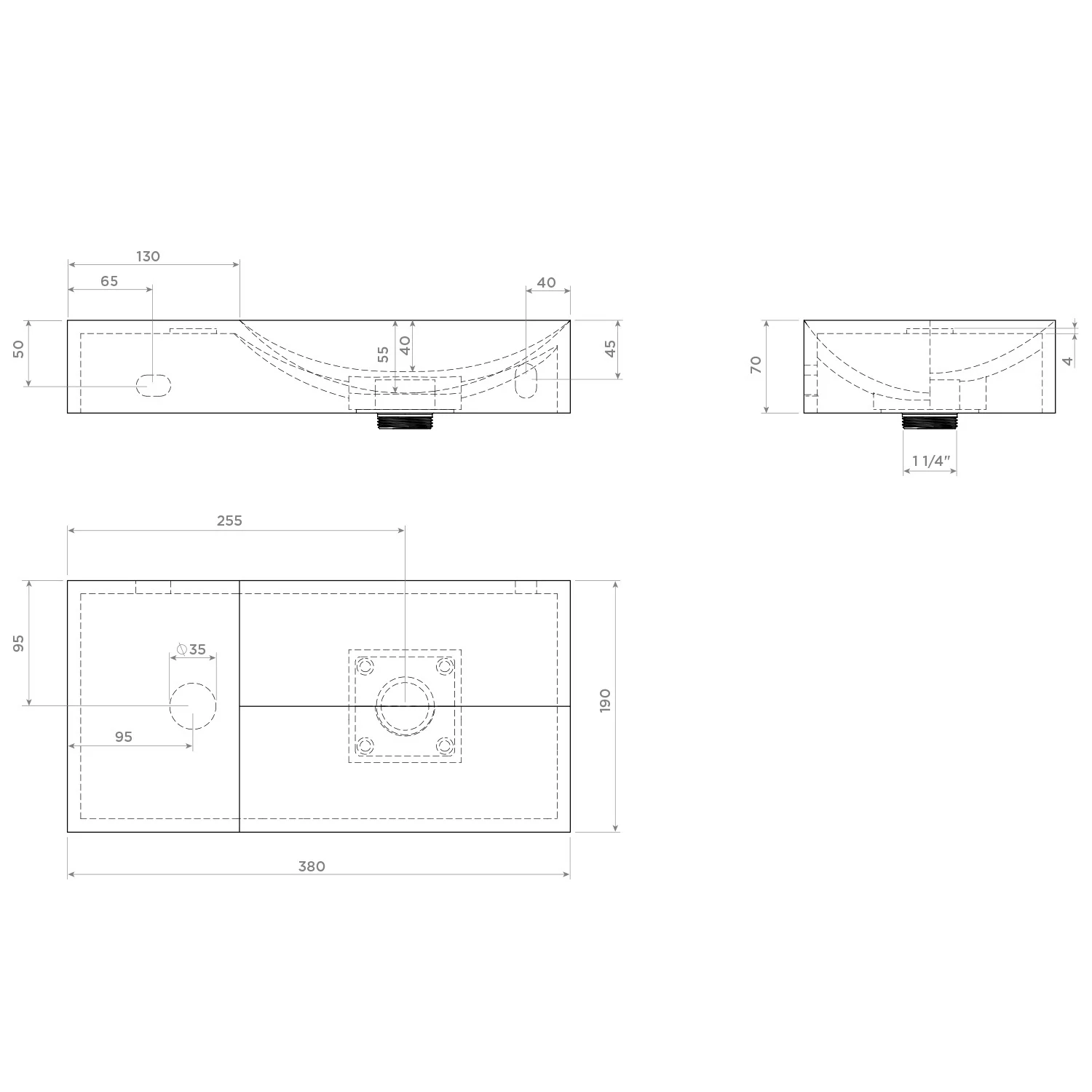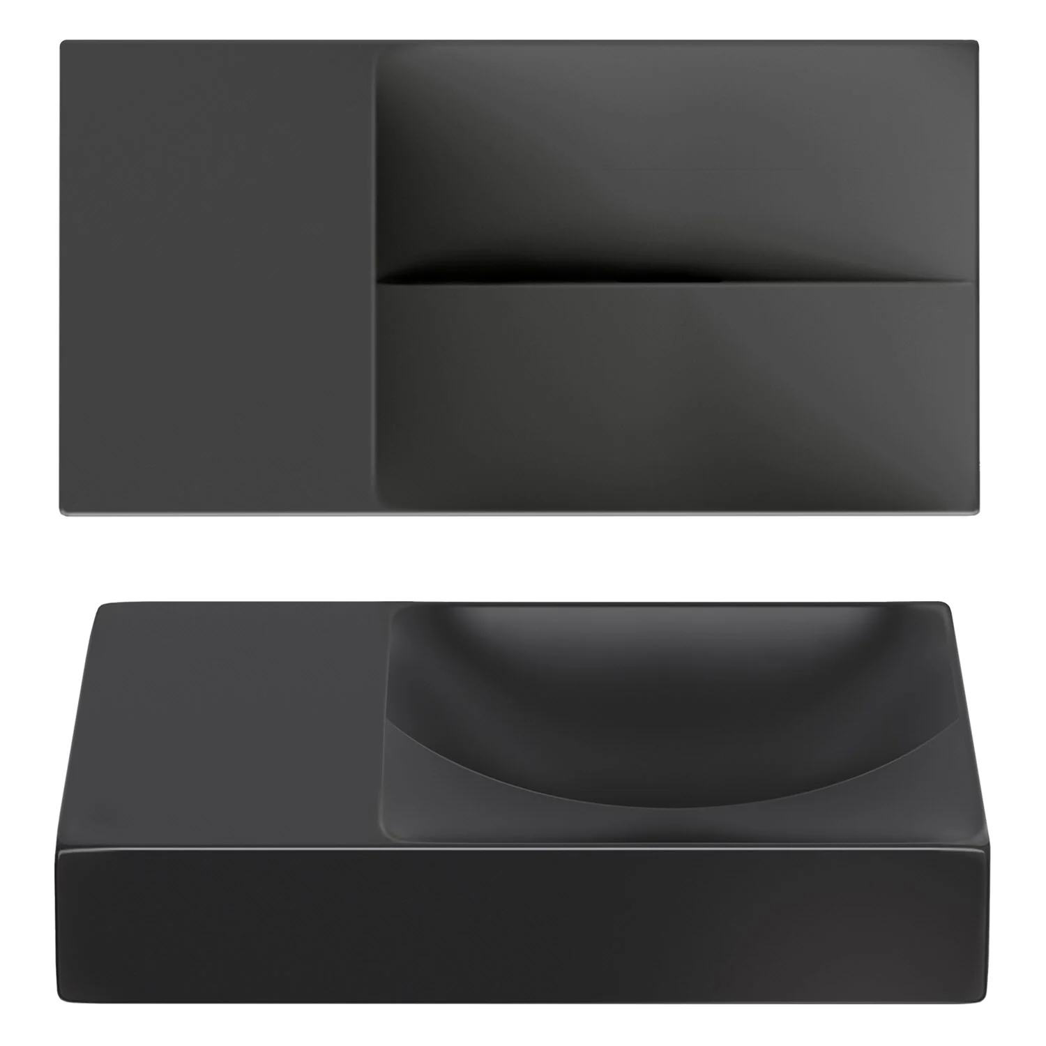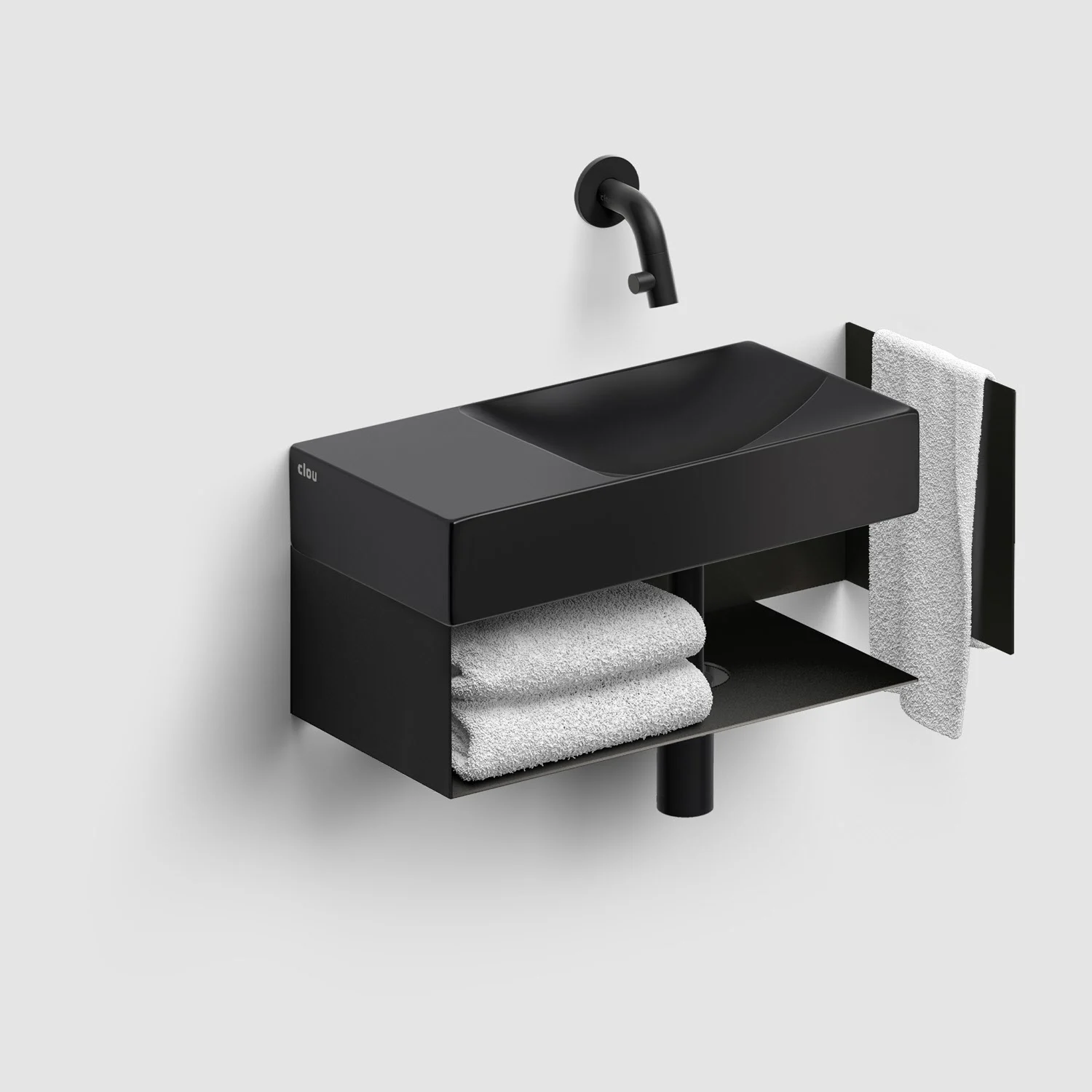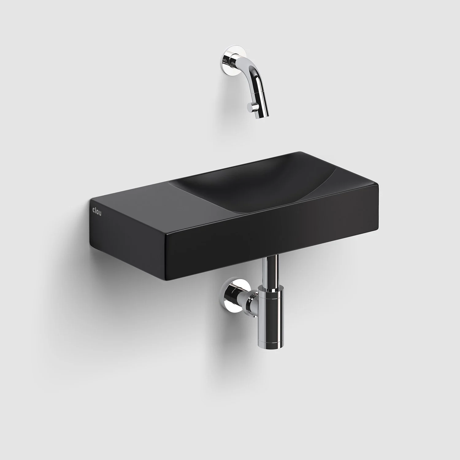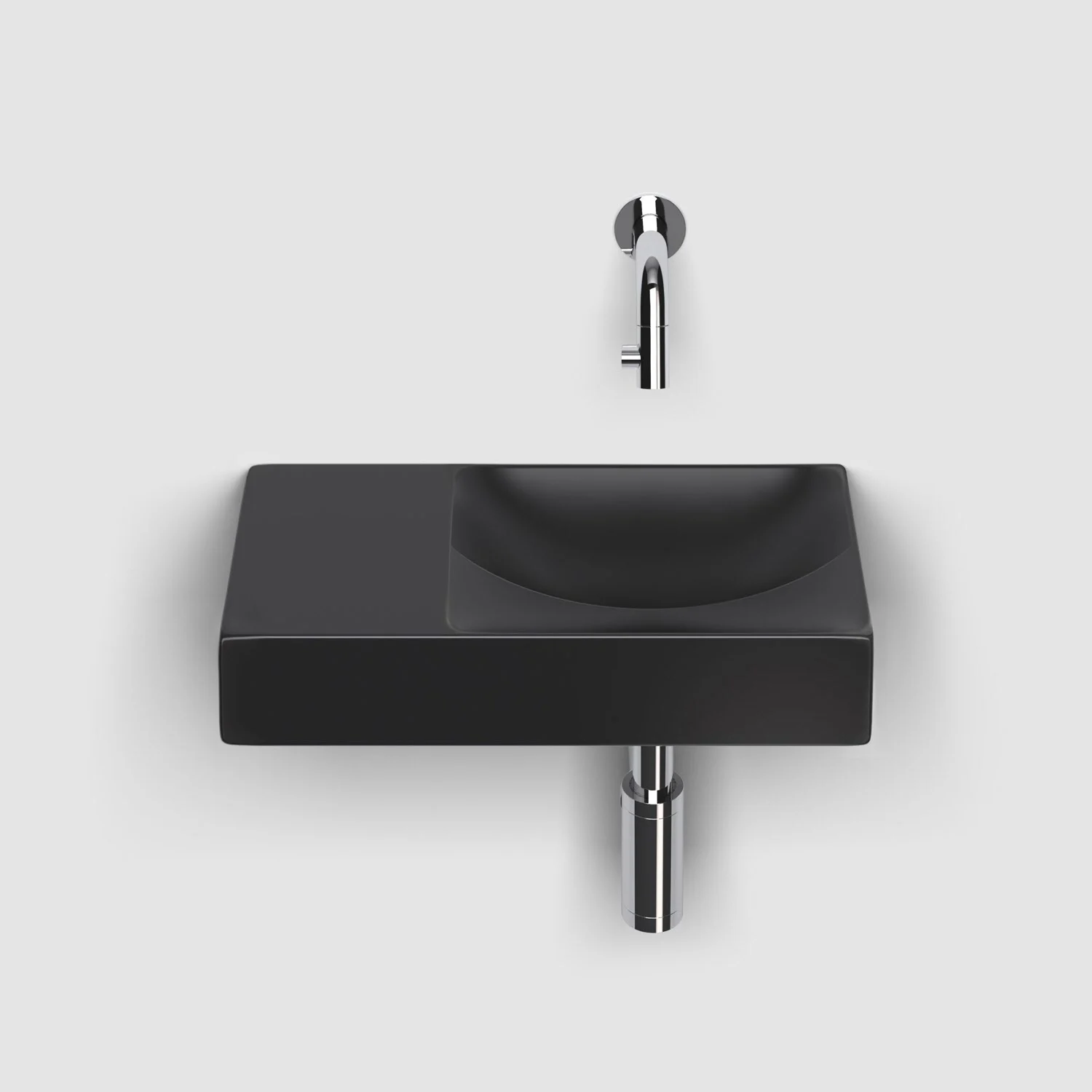 Zwei Ebenen, zwei Kurven mit unterschiedlichen Höhen. Ein einfallsreiches Design sorgt dafür, dass Wasser ordentlich abfließt. Keine Ablaufgarnitur erforderlich. An die Ablaufplatte am Boden des Handwaschbeckens kann jeder handelsübliche Siphon montiert werden.