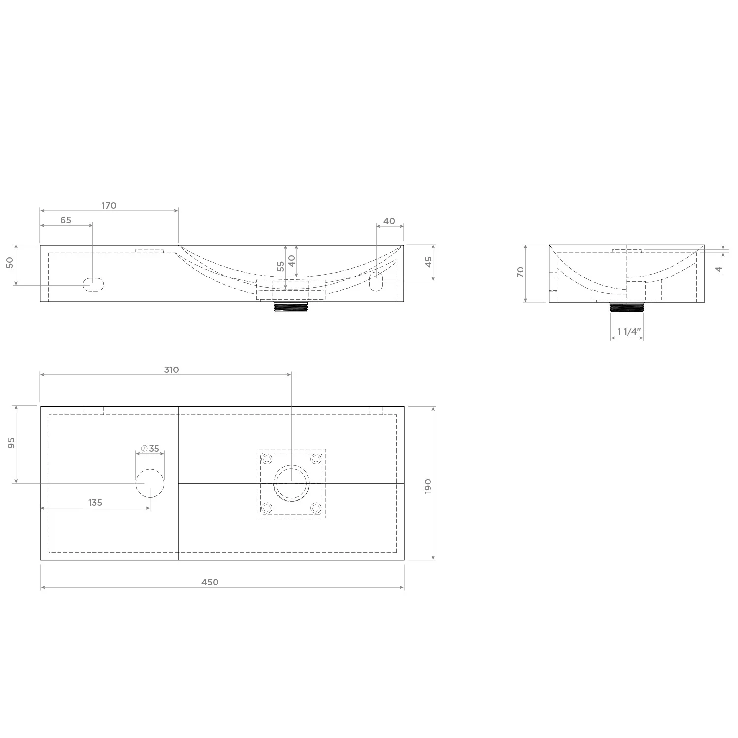 Zwei Ebenen, zwei Kurven mit unterschiedlichen Höhen. Ein einfallsreiches Design sorgt dafür, dass Wasser ordentlich abfließt. Keine Ablaufgarnitur erforderlich. An die Ablaufplatte am Boden des Handwaschbeckens kann jeder handelsübliche Siphon montiert werden.