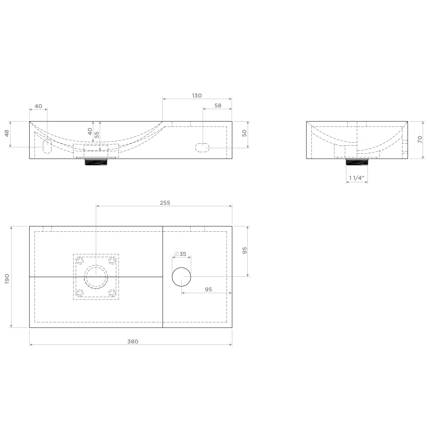 Zwei Ebenen, zwei Kurven mit unterschiedlichen Höhen. Ein einfallsreiches Design sorgt dafür, dass Wasser ordentlich abfließt. Keine Ablaufgarnitur erforderlich. An die Ablaufplatte am Boden des Handwaschbeckens kann jeder handelsübliche Siphon montiert werden.