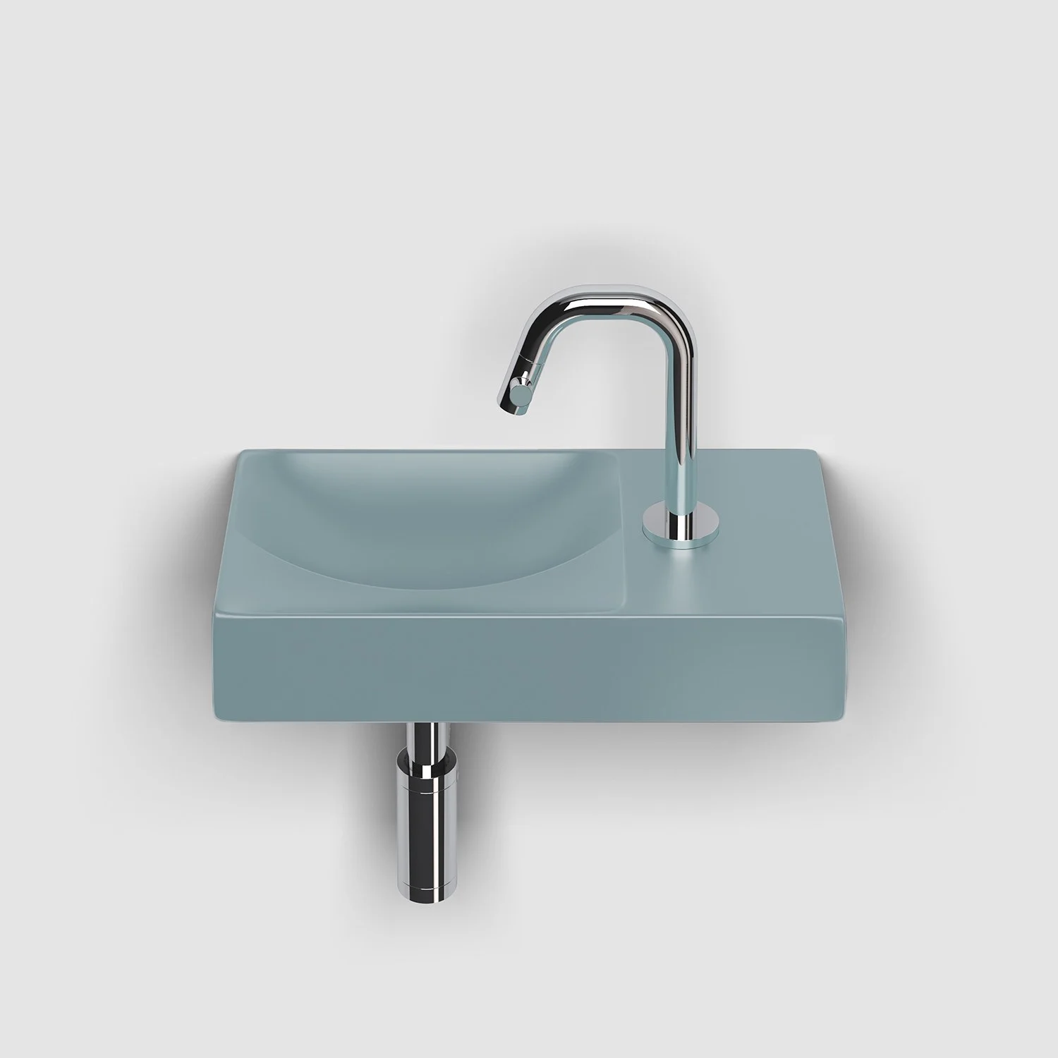 Zwei Ebenen, zwei Kurven mit unterschiedlichen Höhen. Ein einfallsreiches Design sorgt dafür, dass Wasser ordentlich abfließt. Keine Ablaufgarnitur erforderlich. An die Ablaufplatte am Boden des Handwaschbeckens kann jeder handelsübliche Siphon montiert werden.
