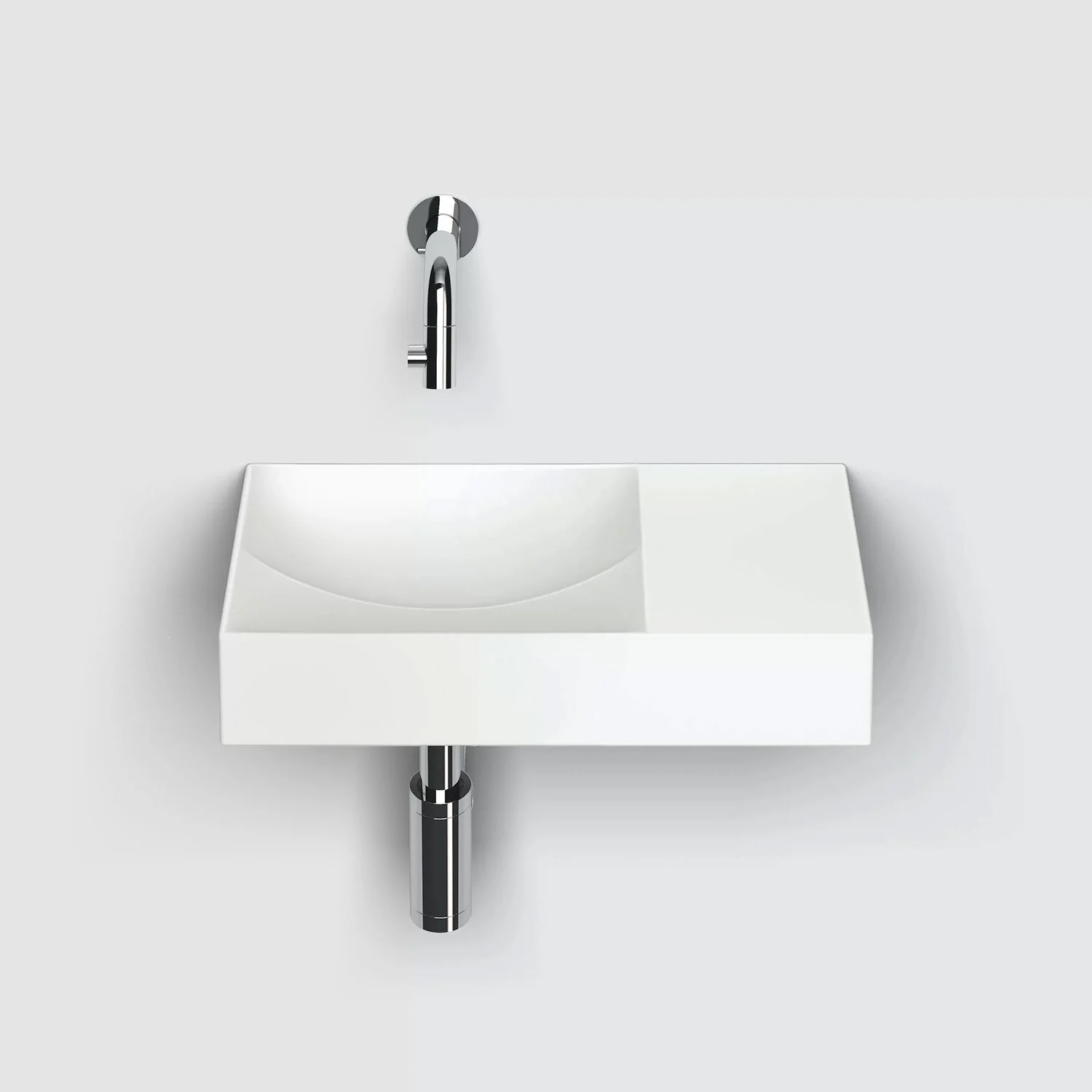 Zwei Ebenen, zwei Kurven mit unterschiedlichen Höhen. Ein einfallsreiches Design sorgt dafür, dass Wasser ordentlich abfließt. Keine Ablaufgarnitur erforderlich. An die Ablaufplatte am Boden des Handwaschbeckens kann jeder handelsübliche Siphon montiert werden.
