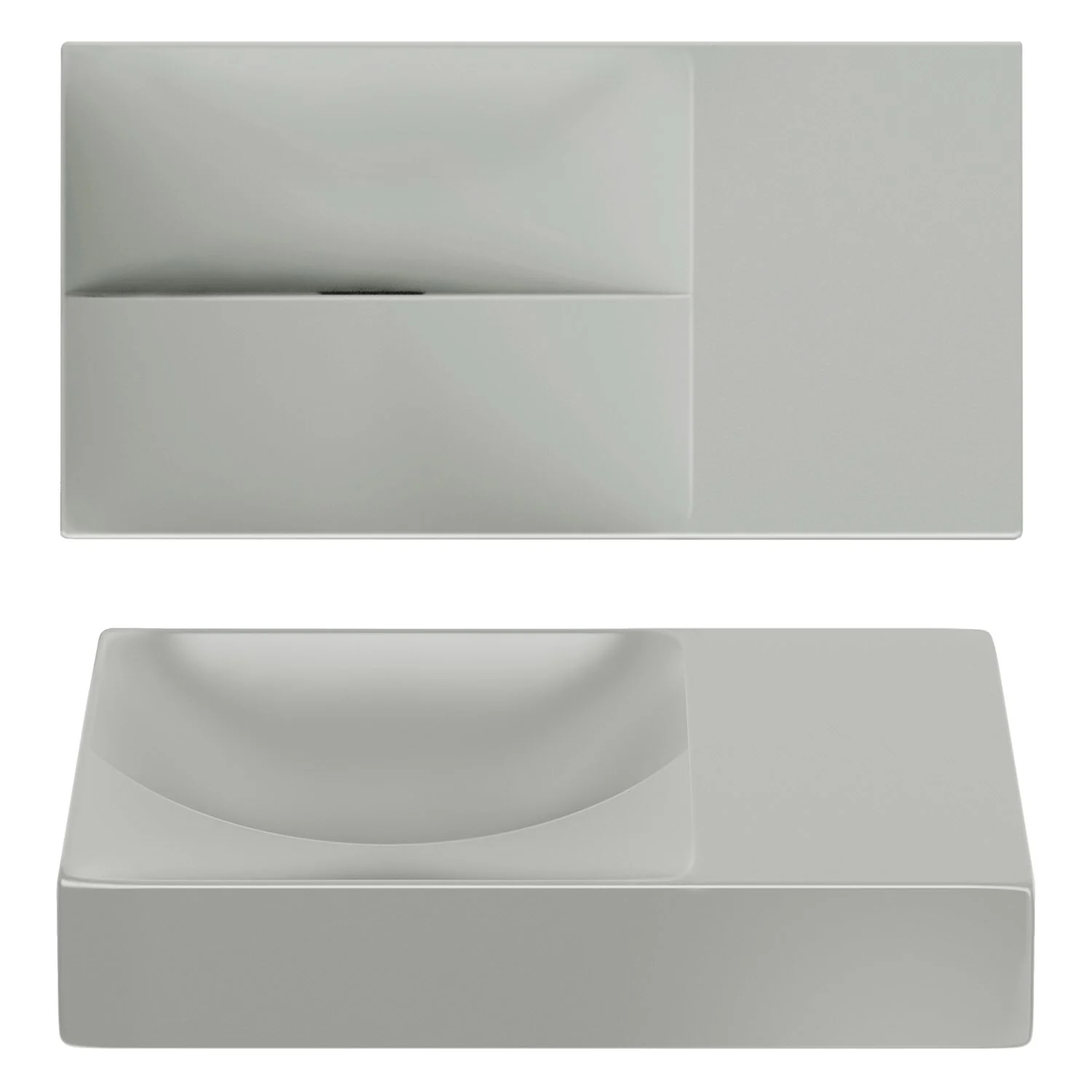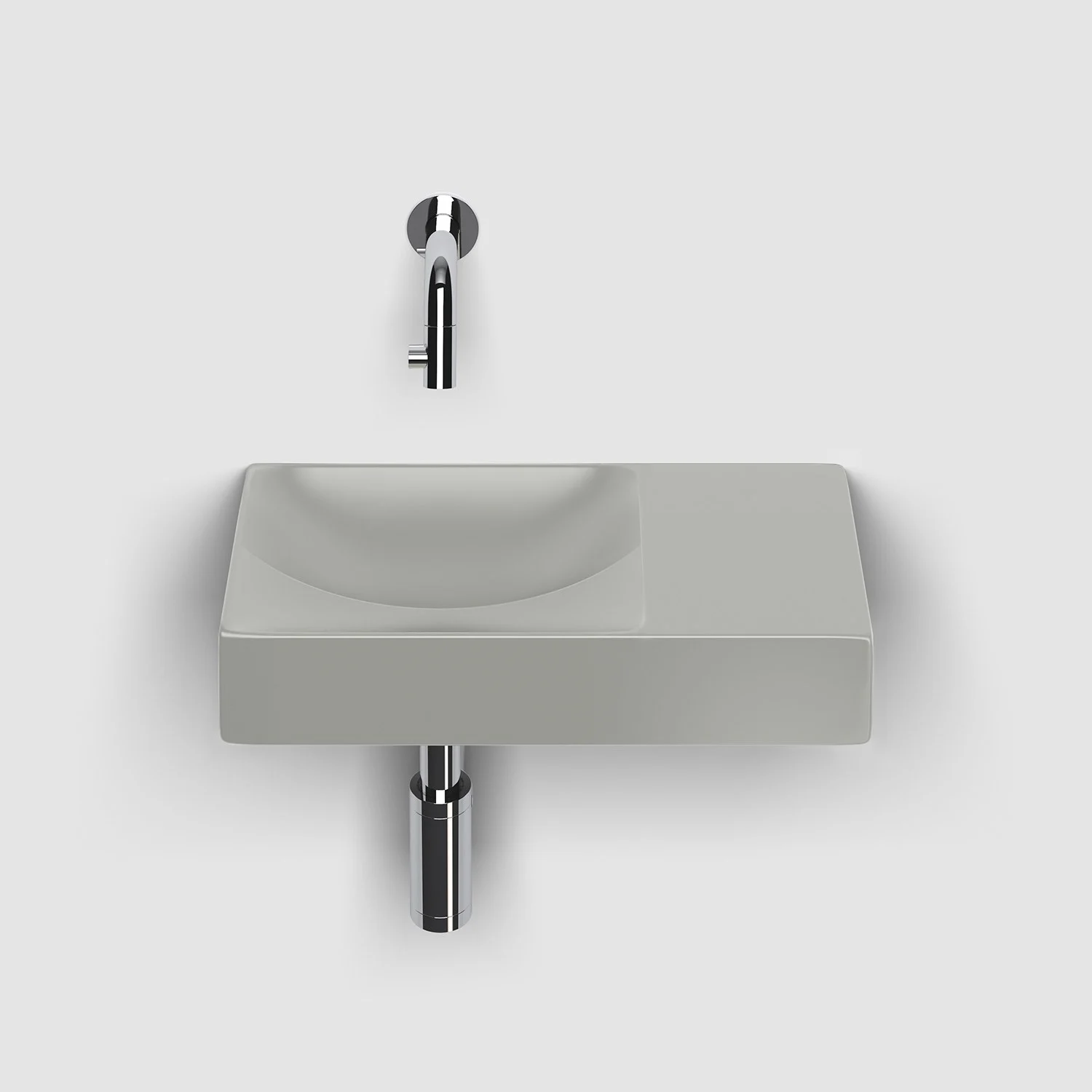 Zwei Ebenen, zwei Kurven mit unterschiedlichen Höhen. Ein einfallsreiches Design sorgt dafür, dass Wasser ordentlich abfließt. Keine Ablaufgarnitur erforderlich. An die Ablaufplatte am Boden des Handwaschbeckens kann jeder handelsübliche Siphon montiert werden.