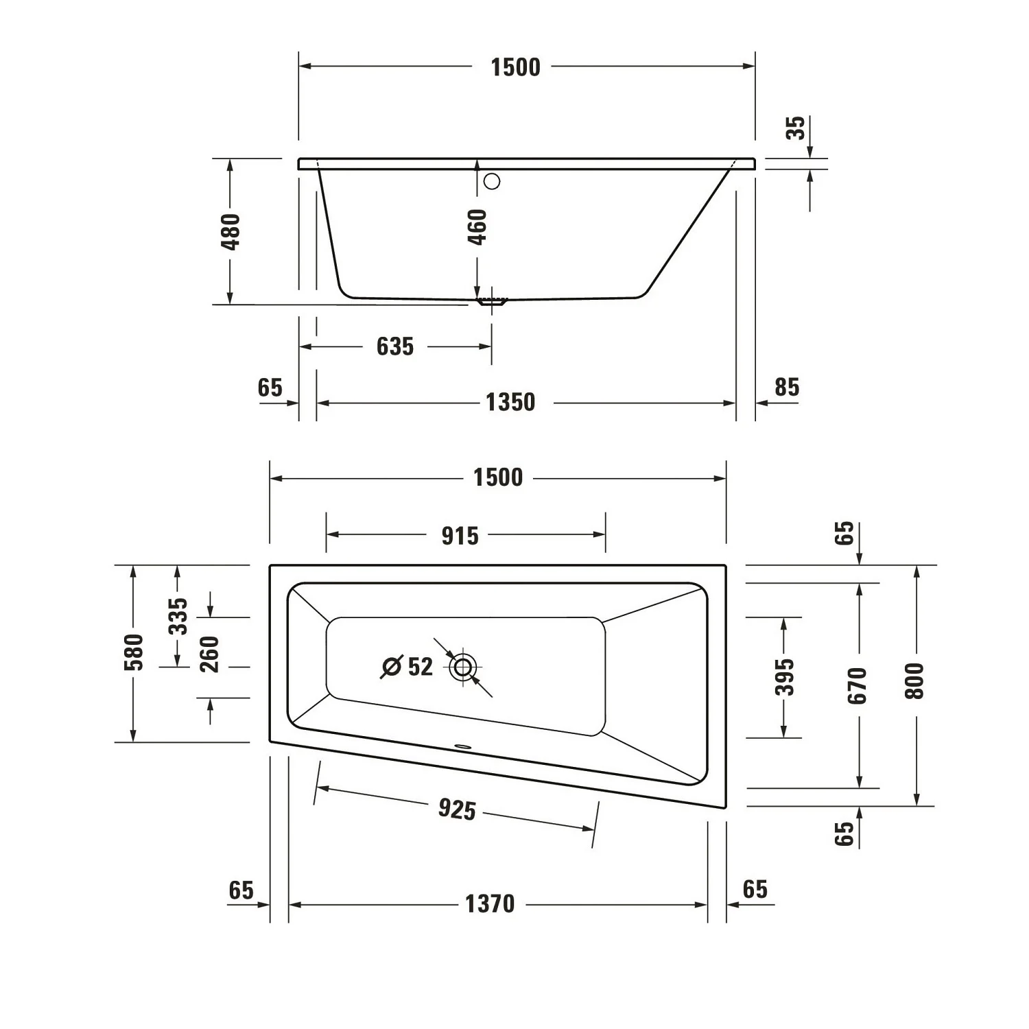 Duravit No. 1 Trapez-Badewanne 150 x 80 cm mit 1 Rückenschräge rechts