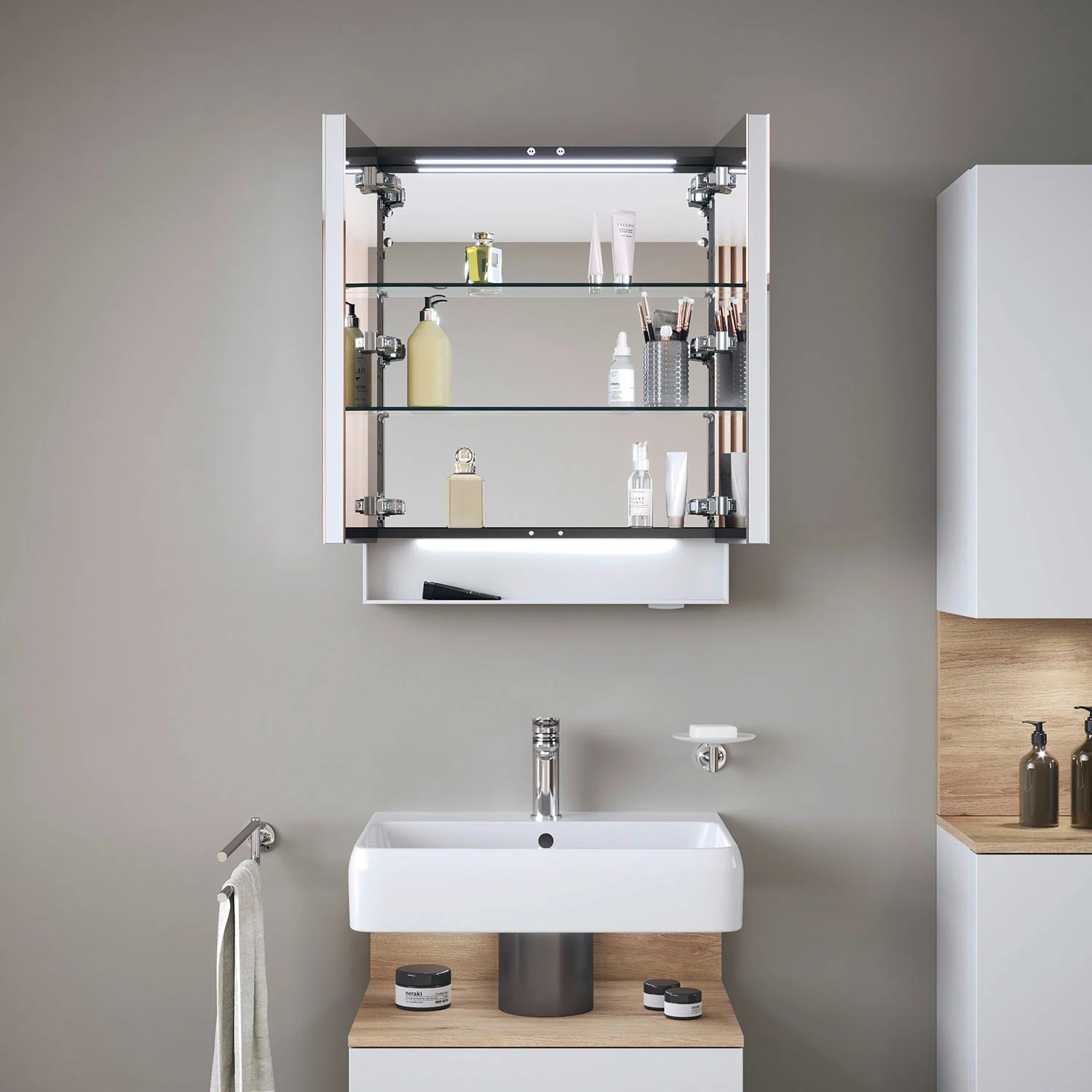 - eine integrierte Innenbeleuchtung sorgt für zusätzlichen Überblick im Spiegelschrank