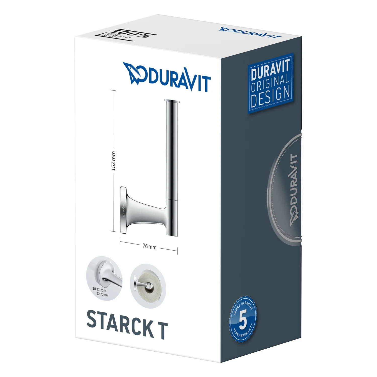 Form und Funktion vereinen sich zu einem ikonischen Accessoire: dem wandhängenden Duravit Starck T Papierrollenhalter. Philippe Starcks Designidee einer T-förmigen Verästelung mit organischem Charakter, die aus einer runden, weich geformten Basis erwächst, zeigt sich gelungen in der formschönen Symmetrie des Papierrollenhalters. Dank des verdeckten Befestigungssystems wird die wohlproportionierte Formgebung durch nichts beeinträchtigt. Zusätzlich bietet es Flexibilität bei der Montage, da der Papierrollenhalter sowohl an die Wand geschraubt als auch geklebt werden kann. Ein Design-Accessoire fürs Bad, dessen hochwertige Verarbeitung in verschiedenen Oberflächen alle Blicke auf sich zieht und perfekt mit den weiteren Accessoires aus der Starck T Designlinie harmoniert.