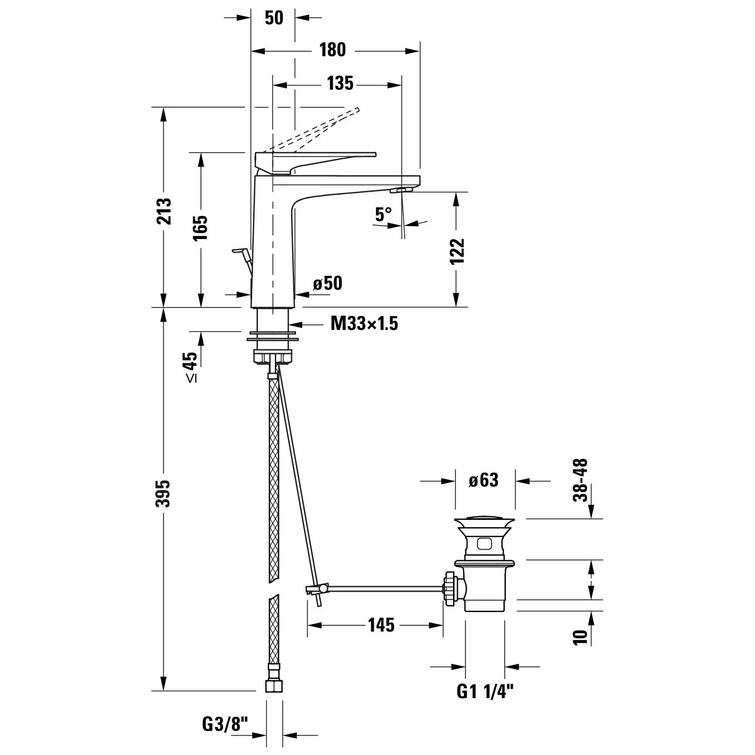 - einfache Installation: Armatur wird über flexible Anschlussschläuche 3/8" mit vorhandenen Wasseranschlüssen verbunden