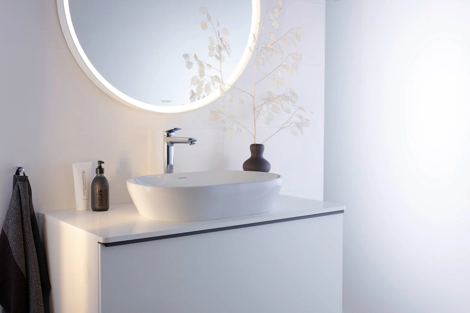 - Armatur mit erhöhtem Auslauf für großzügige Bewegungsfreiheit zwischen Becken und Armatur