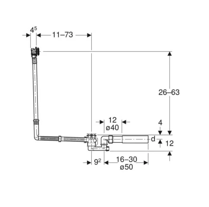 Geberit Badewannen-Ablauf mit Drehbetätigung und Zulauf, D52, Länge 73 cm, für Sonderwanne