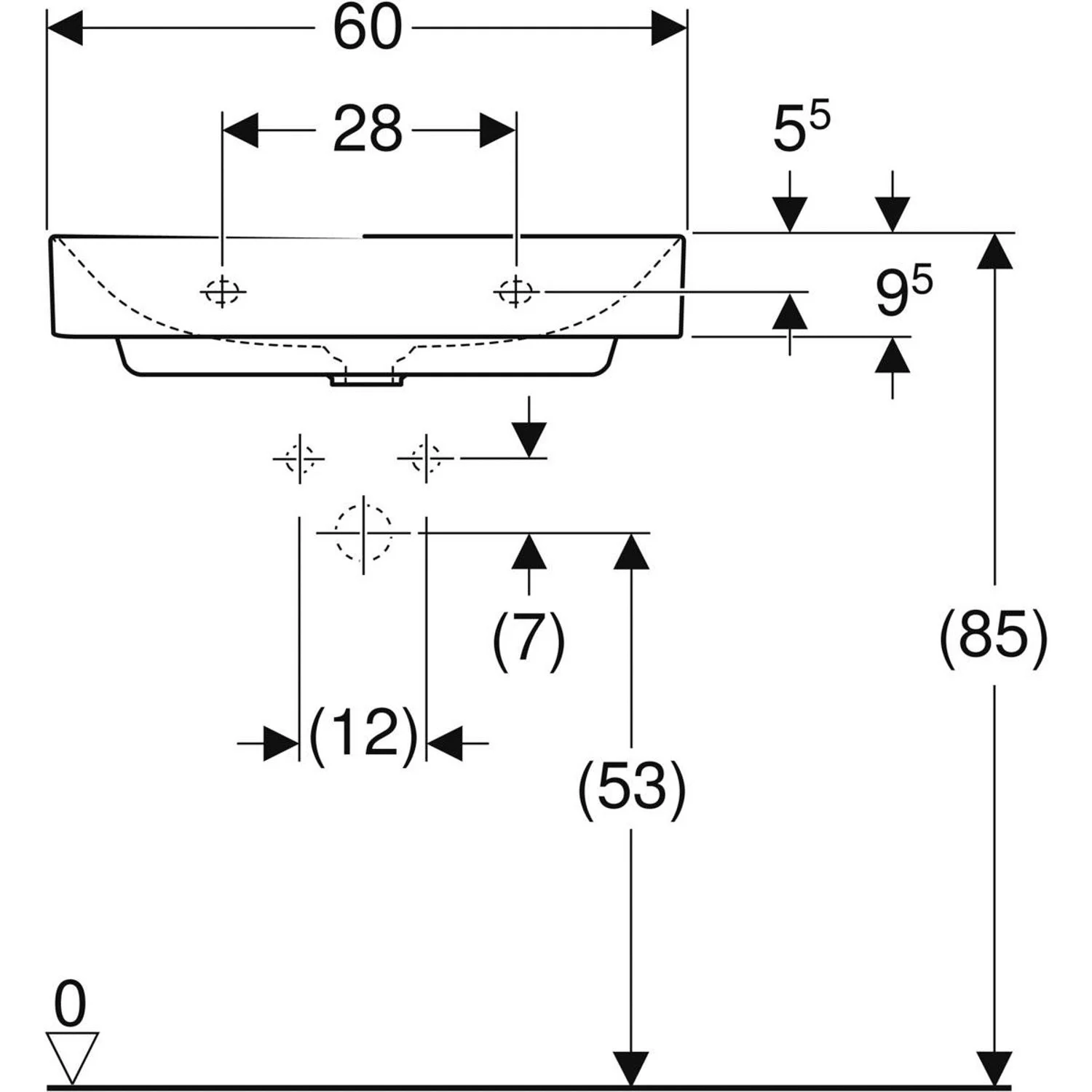 Geberit ONE Waschtisch 60 cm, Abgang vertikal, ohne Hahnloch, ohne Überlauf