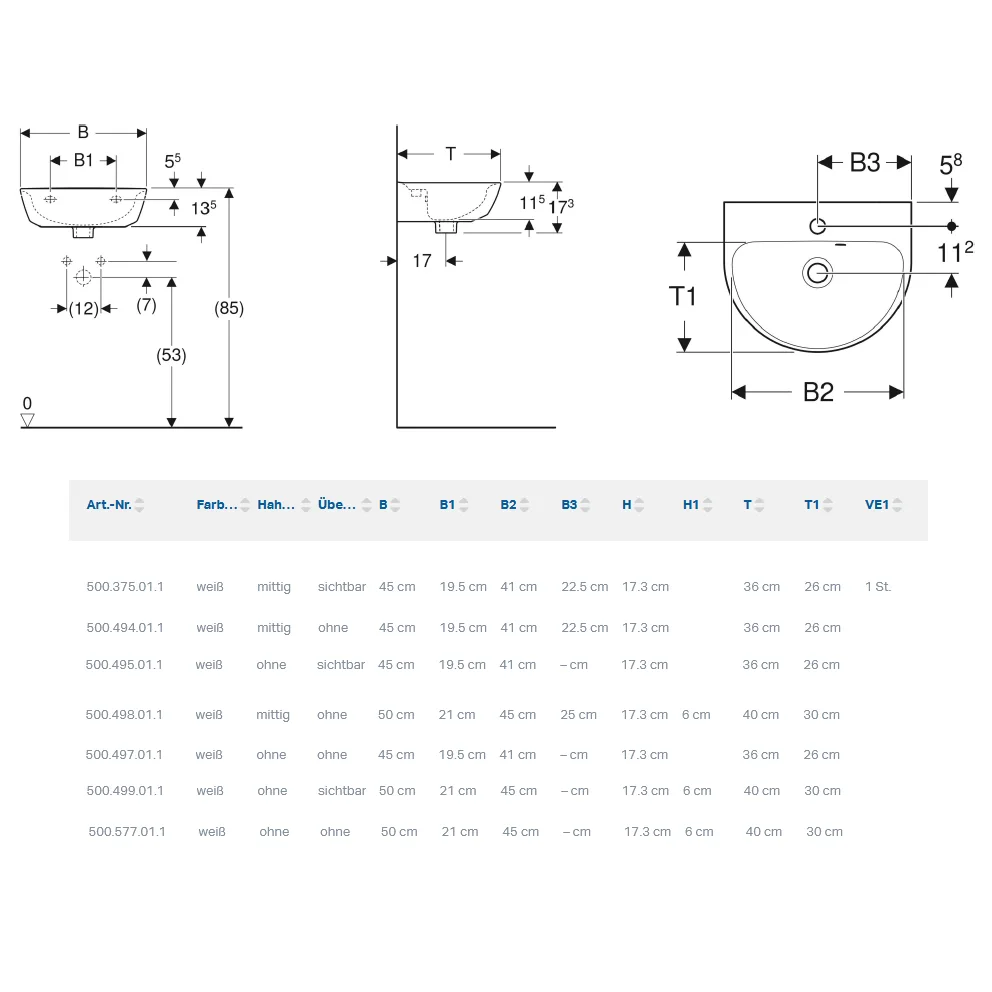 Geberit Renova Handwaschbecken 45 x 36 cm mit Hahnloch und Überlauf