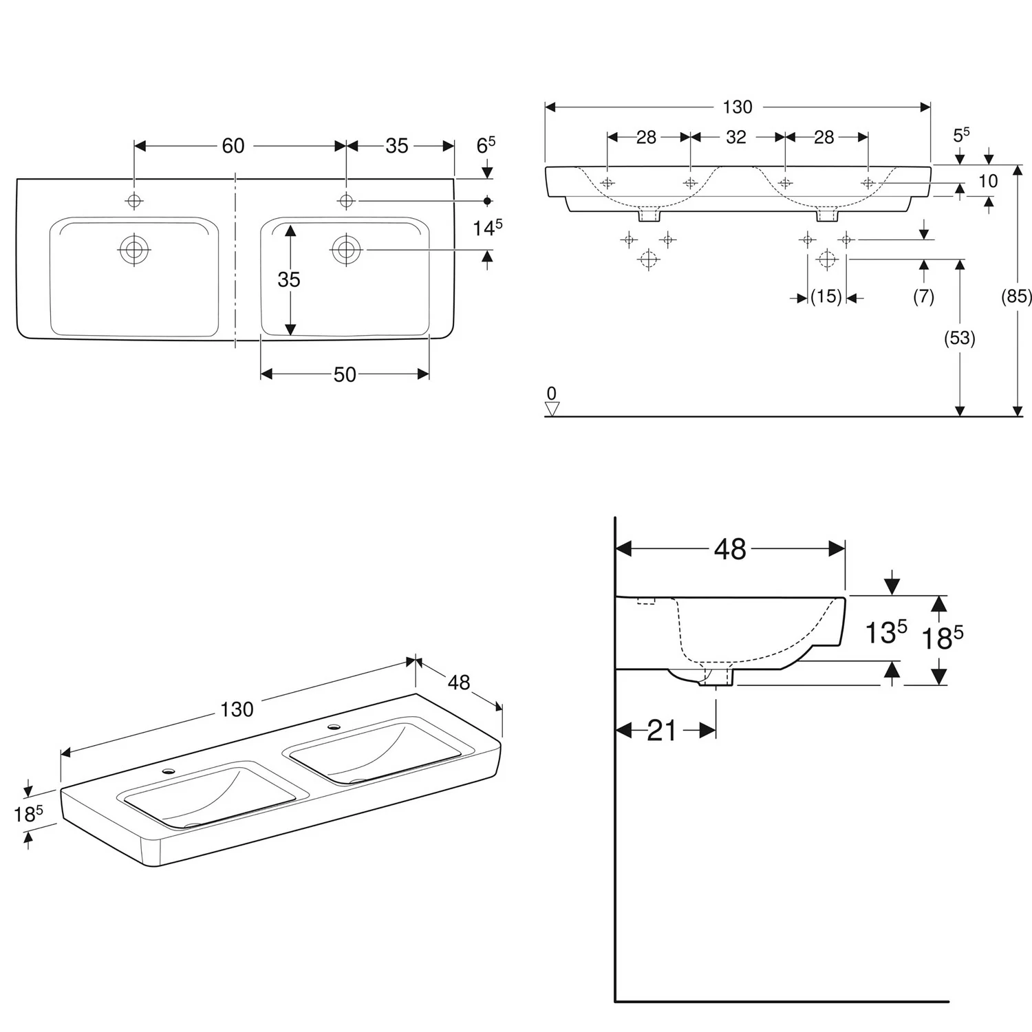 Geberit Renova Plan Doppelwaschtisch 130 cm mit Ablagefläche, mit 2 Hahnlöchern, ohne Überlauf