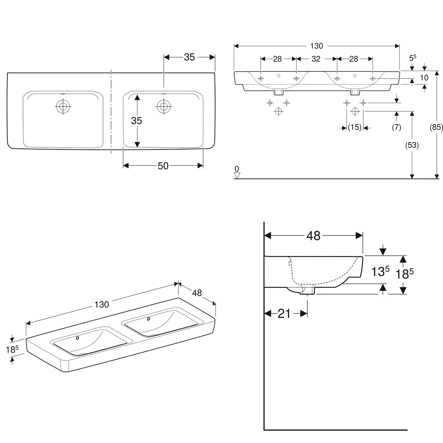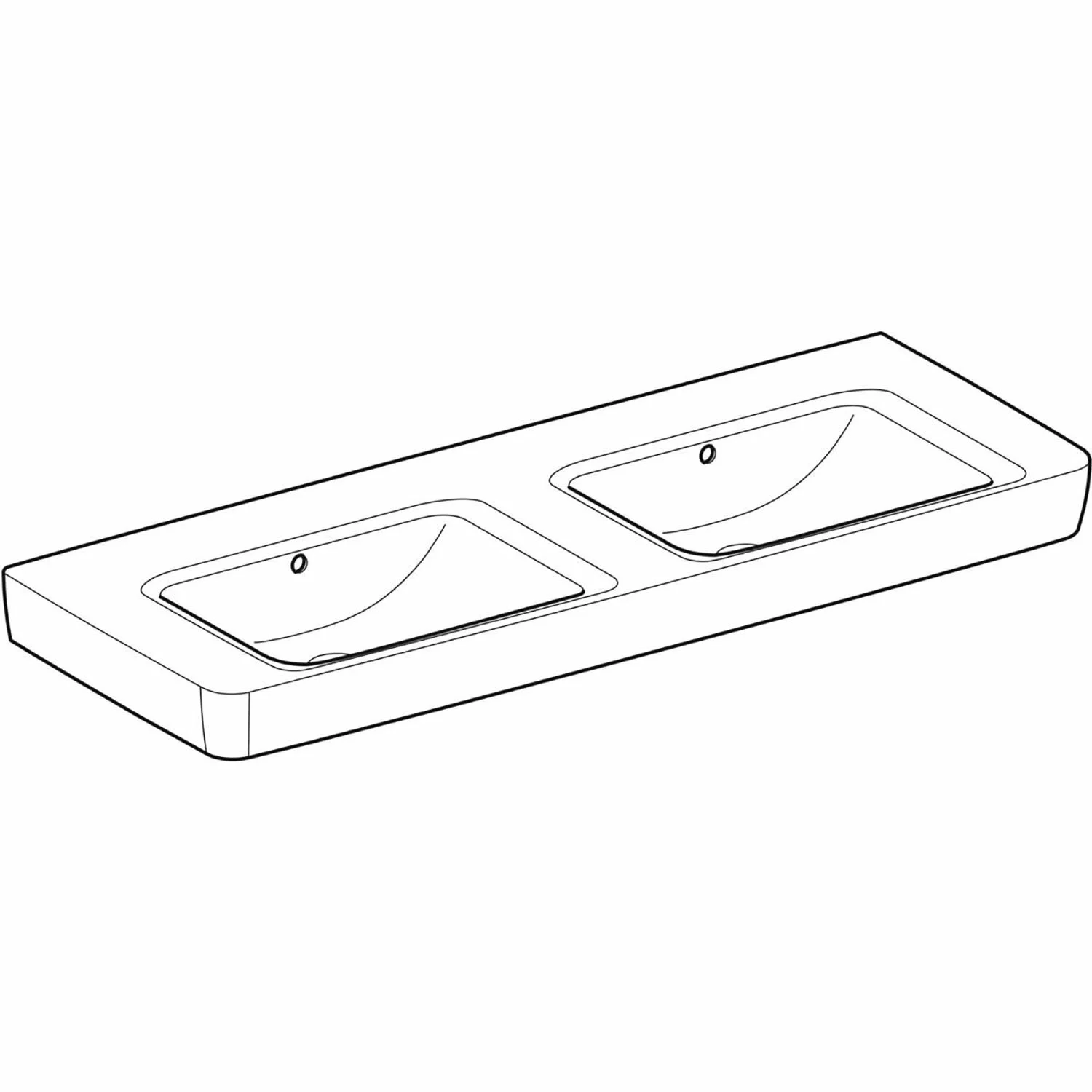 Geberit Renova Plan Doppelwaschtisch 130 cm mit Ablagefläche, ohne Hahnloch, mit Überlauf