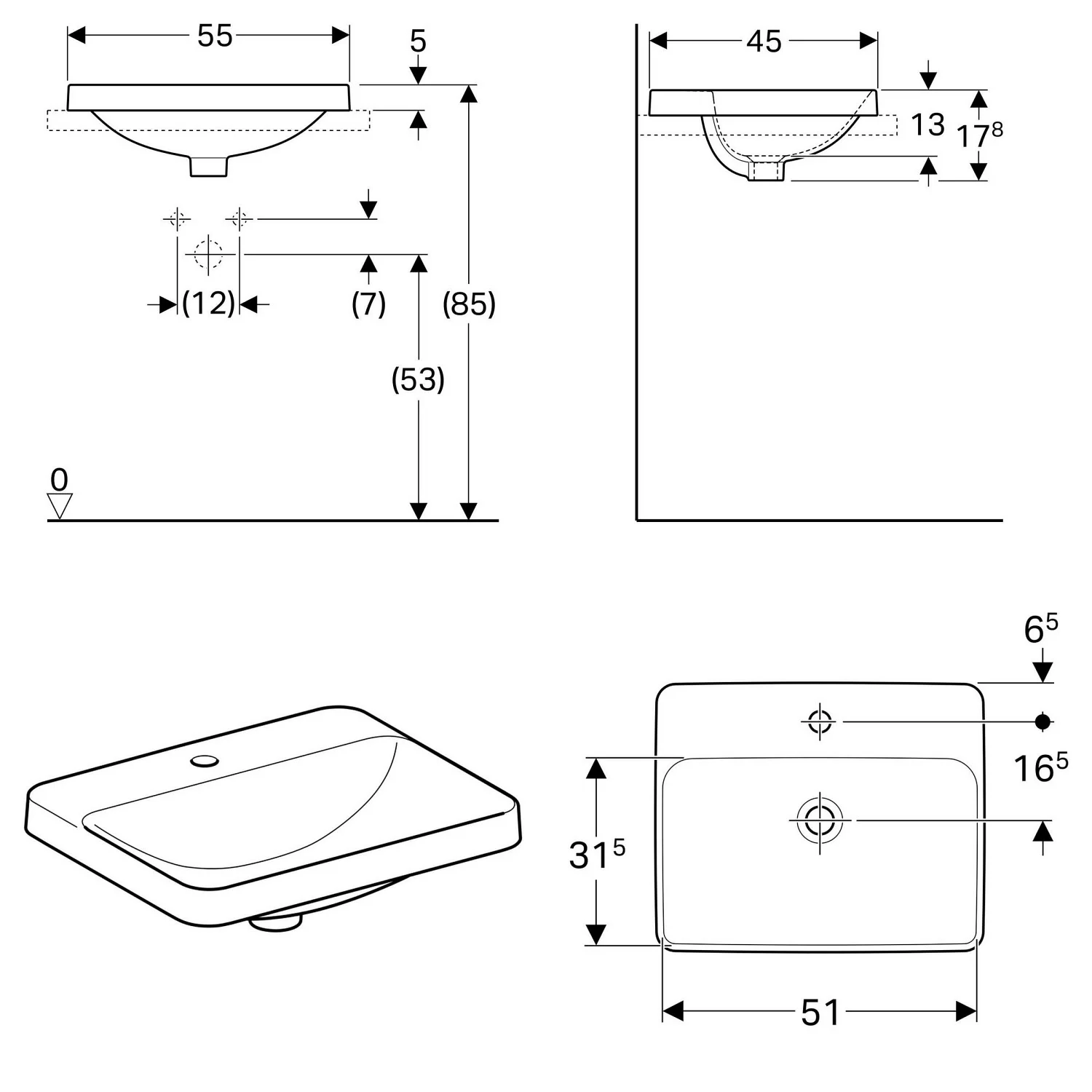 Geberit VariForm Einbauwaschtisch, rechteckig, mit Hahnlochbank