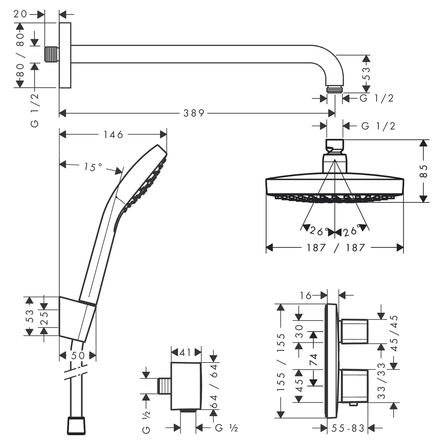 - Kopfbrause (Croma Select E 180 2jet), Handbrause (Croma Select E 1jet), Duschthermostat (Ecostat E Unterputz), Grundkörper iBox universal, Duscharm, Duschhalter (Porter S), Wandanschluss (FixFit), Duschschlauch (Isiflex, 1,25 m)