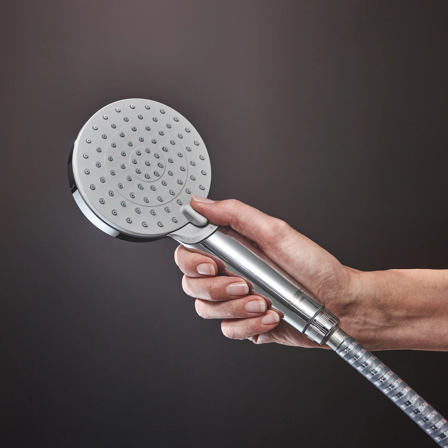 - schnelle Strahlumstellung: direkt am Duschkopf durch Drehen der Strahlscheibe
