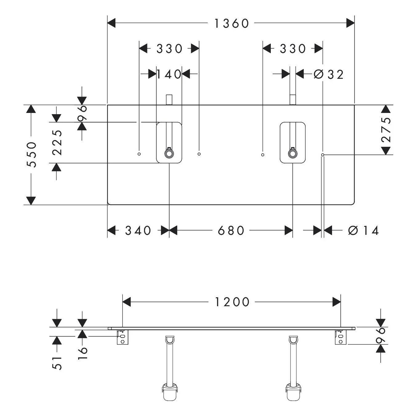 hansgrohe Xelu Q Konsole mit 2 Ausschnitten 136 x 55 cm, für Aufsatzwaschtisch mit Hahnloch