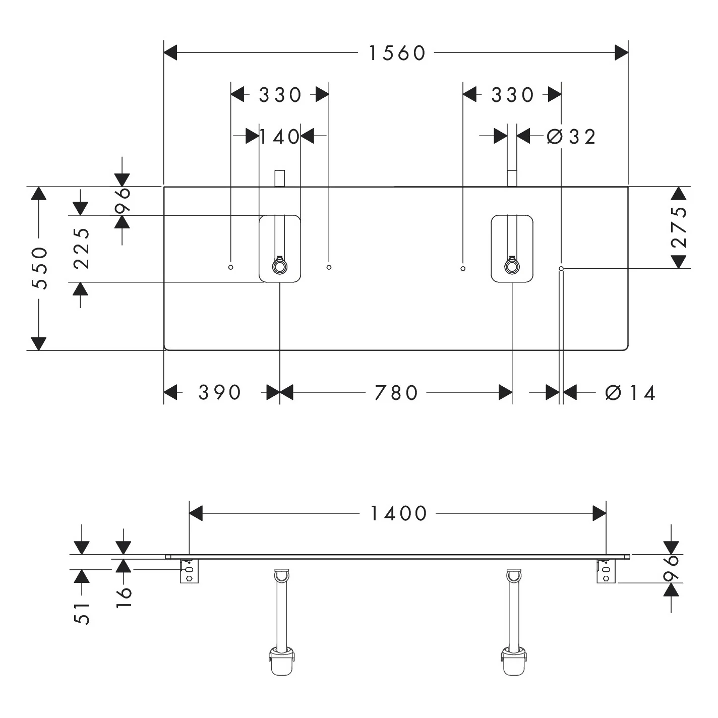 hansgrohe Xelu Q Konsole mit 2 Ausschnitten 156 x 55 cm, für Aufsatzwaschtisch mit Hahnloch