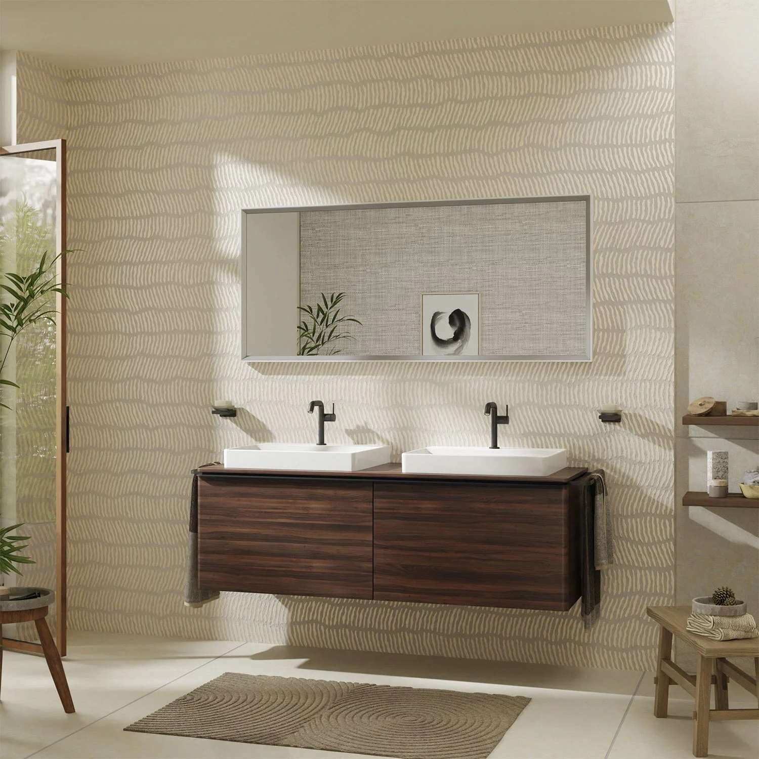 - Schattenfugenprofil (Alu mattschwarz) vorgerichtet für die Montage von Handtuchhalter und Ablage