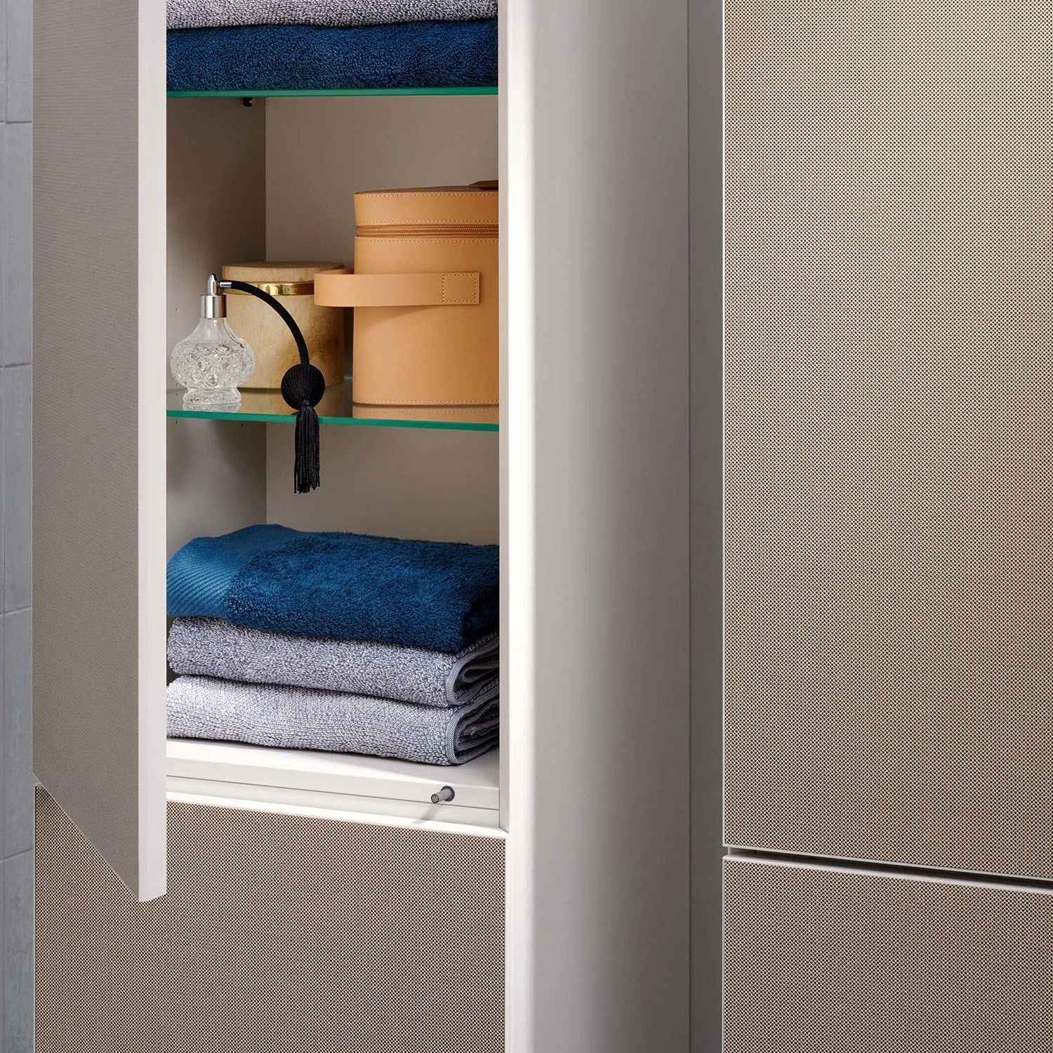 - Lieferumfang: Befestigungsmaterial, Montageanleitung, Hochschrank, Glasfachböden
