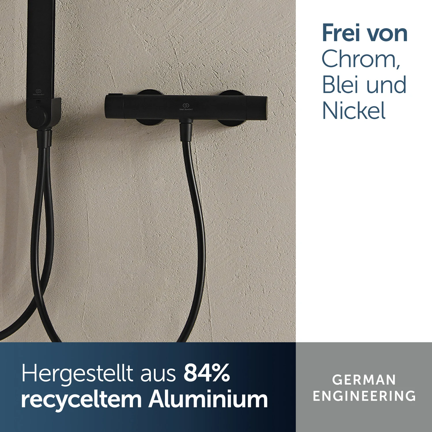 Das Alu+ Brausethermostat von Ideal Standard ist nachhaltig, da es aus 84 % recyceltem Aluminium hergestellt wird und 100 % recycelbar ist. Die Verwendung von recyceltem Aluminium reduziert den Ressourcenverbrauch und minimiert Abfall. Es ist frei von Chrom, Blei und Nickel. Das Alu+ Brausethermostat ist Teil eines nachhaltigen Ansatzes für die Badgestaltung, der die Umwelt schont.