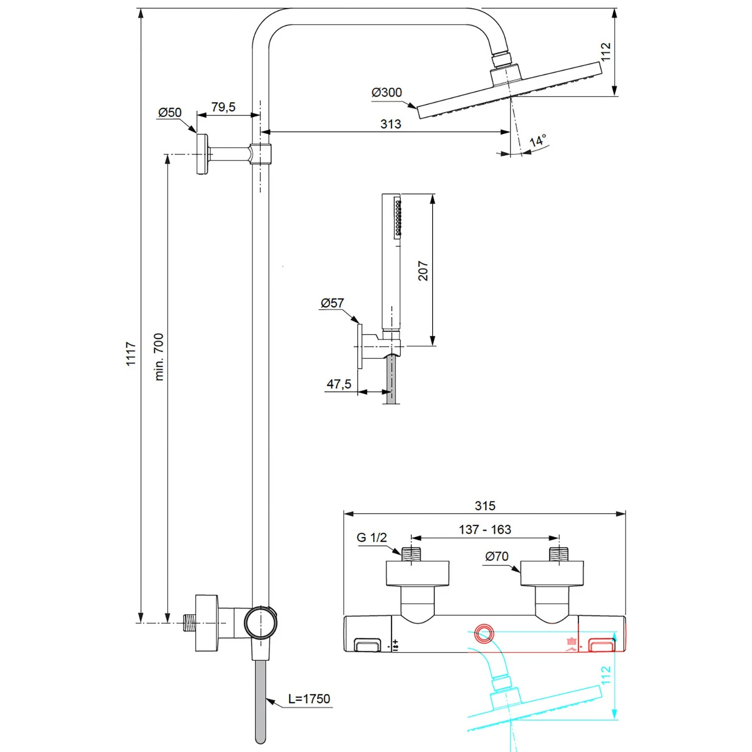 Eigenschaften:- Duschsystem mit Brausethermostat Aufputz