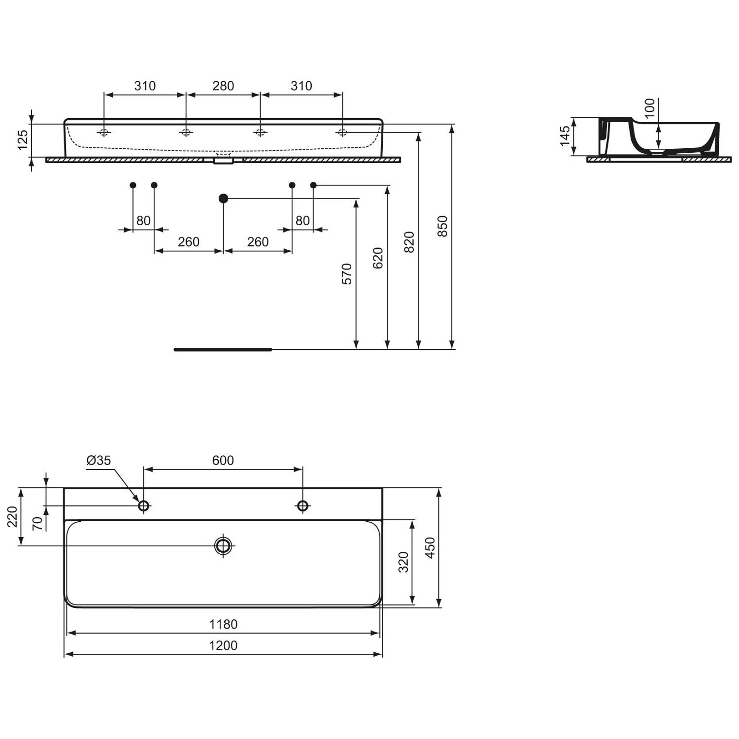 Ideal Standard Conca Waschtisch 120 cm, 2 Hahnlöcher, ohne Überlauf
