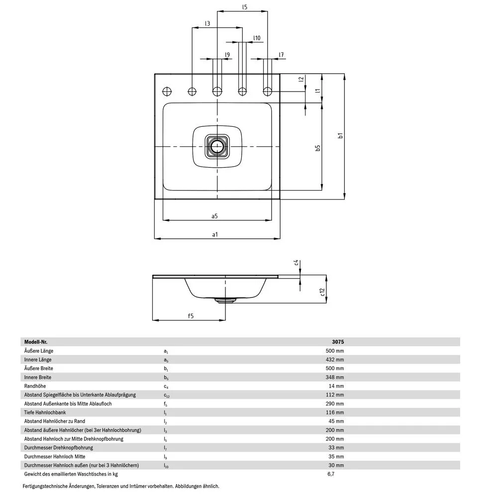 Kaldewei CONO Einbauwaschtisch 3075 mit 1 Hahnlochbohrung, 50 cm
