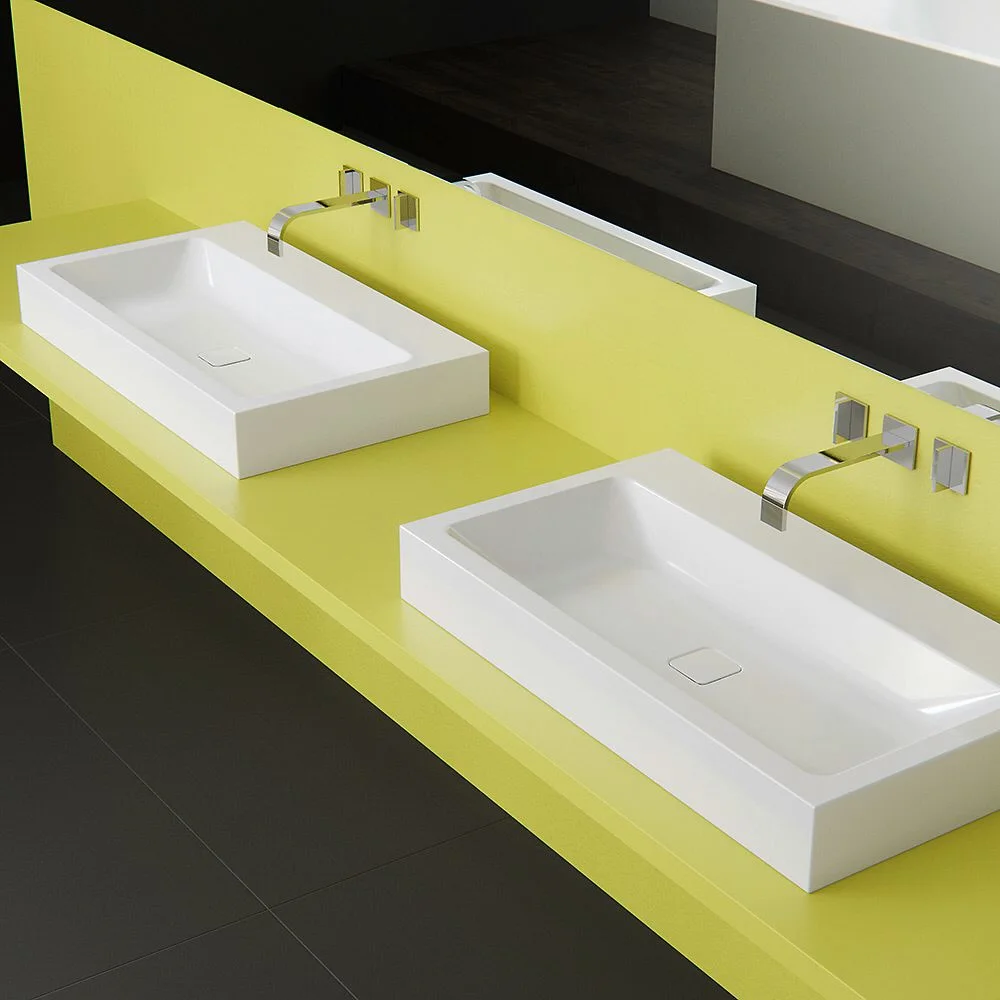 Optimal integrierter emaillierter Ablauf zur vollkommenen Abrundung des geometrischen Erscheinungsbildes und eine äußerst großzügige Fläche für Armatur und individuelle Accessoires