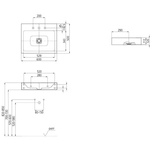 Kaldewei CONO Wandwaschtisch 3089 mit 1 Hahnlochbohrung, 60 cm