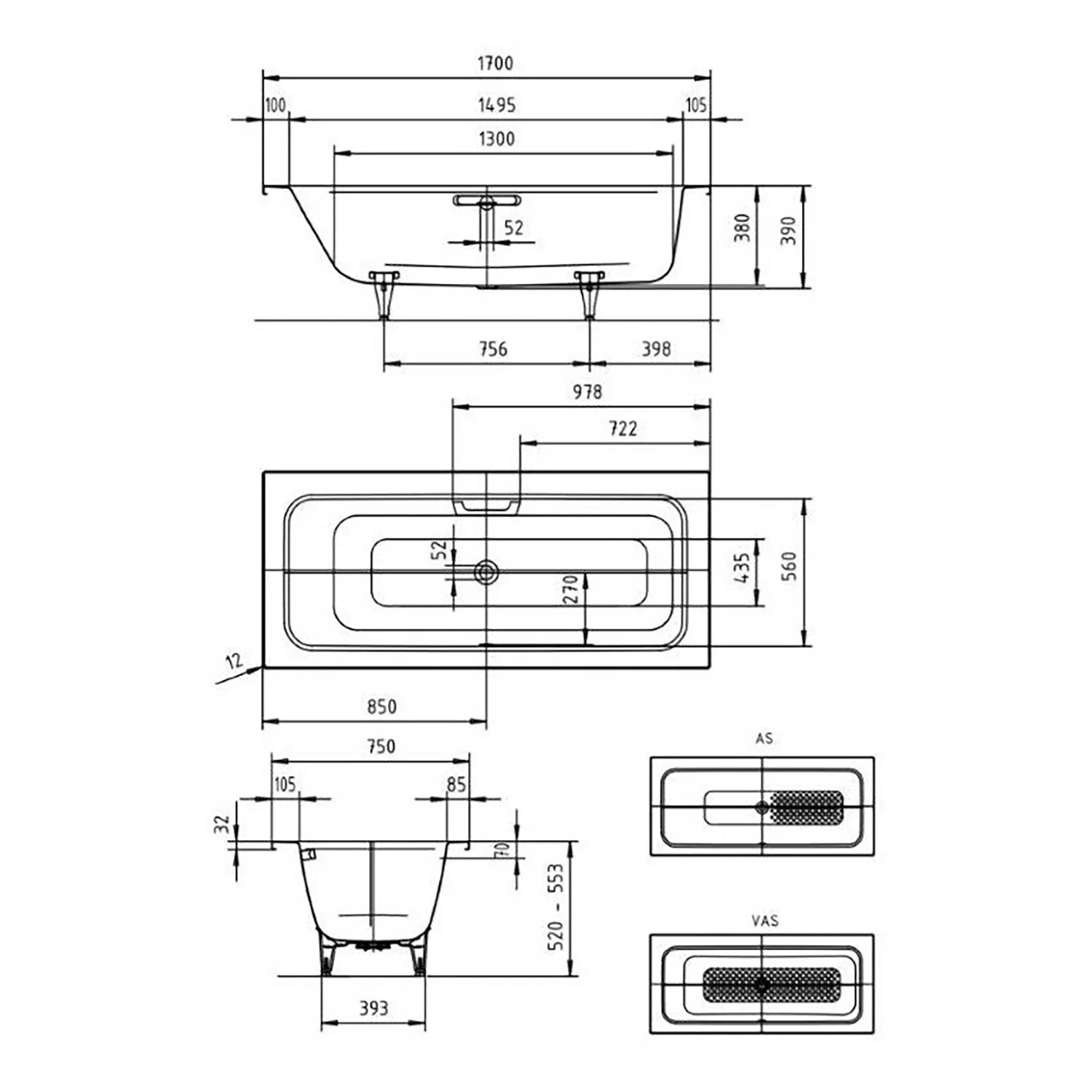 Kaldewei PURO SET WIDE LINKS Mod. 668 Badewanne 170 x 75 cm, mit Perl-Effekt
