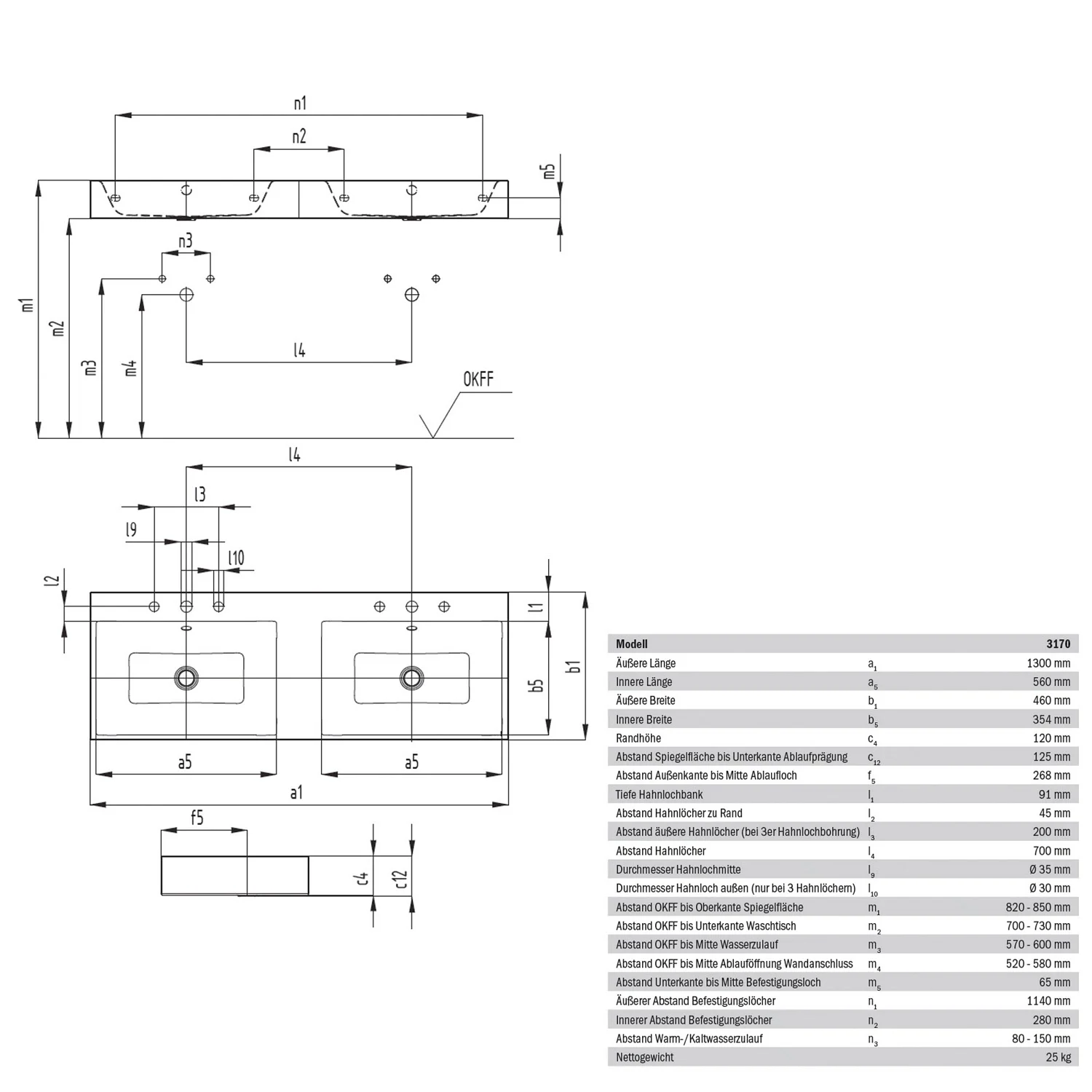 Kaldewei PURO Wand- Doppelwaschtisch 3170 ohne Hahnlochbohrung, 130 cm