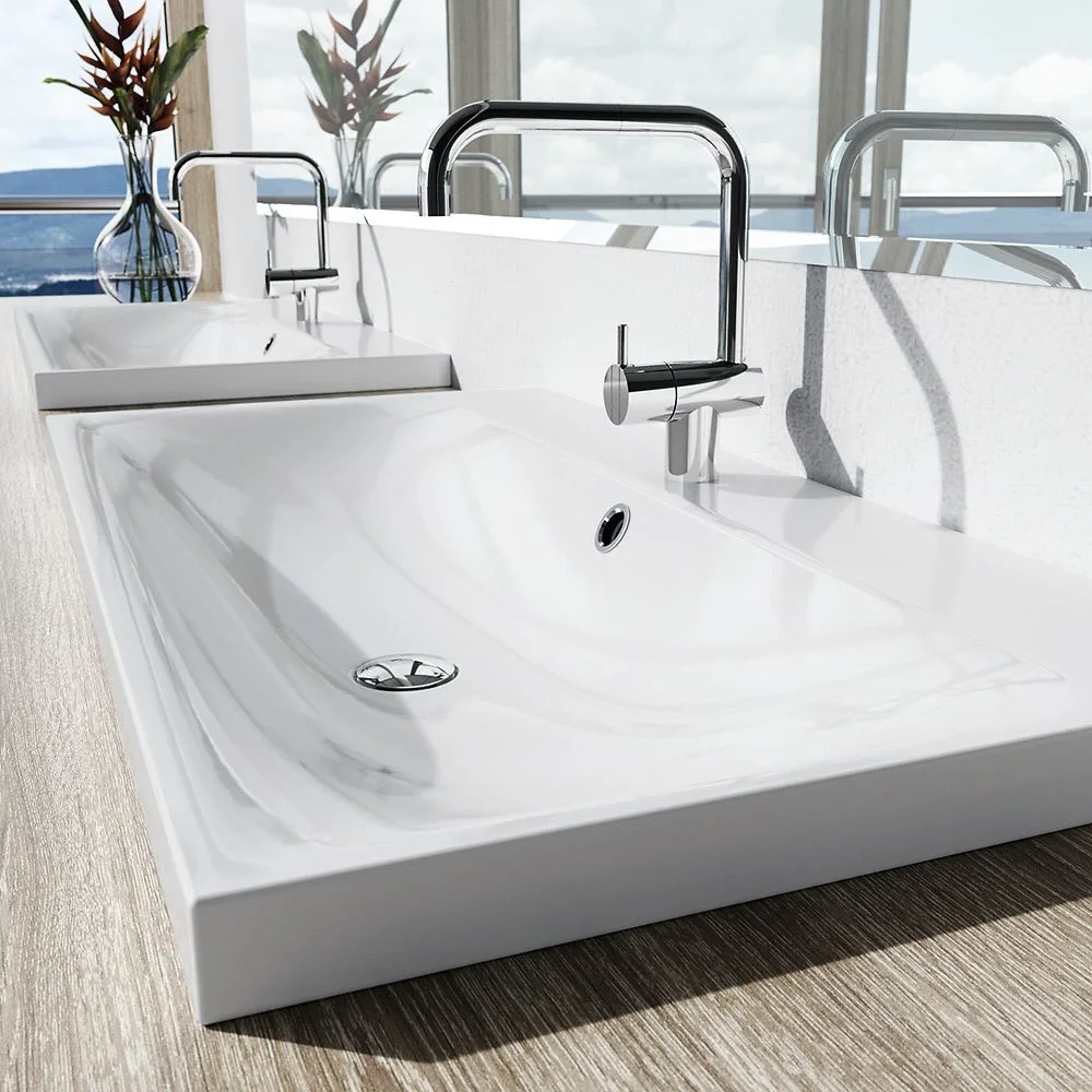 Das sinnlich-moderne Design der SILENIO Serie entfaltet seine volle Wirkung besonders als Wandwaschtisch und beeindruckt durch seine Spannung und Ästhetik. Der Genuss beginnt beim Anblick der weichen, organischen Innenform, die sich nahtlos in den schmalen, präzisen Waschtischrand ausläuft, der nur 14 mm hoch ist. Dieses fließende und filigrane Design lässt den Waschtisch optisch mit der Konsole oder dem Möbel Ihrer Wahl verschmelzen und schafft so eine harmonische Einheit im Badezimmer.