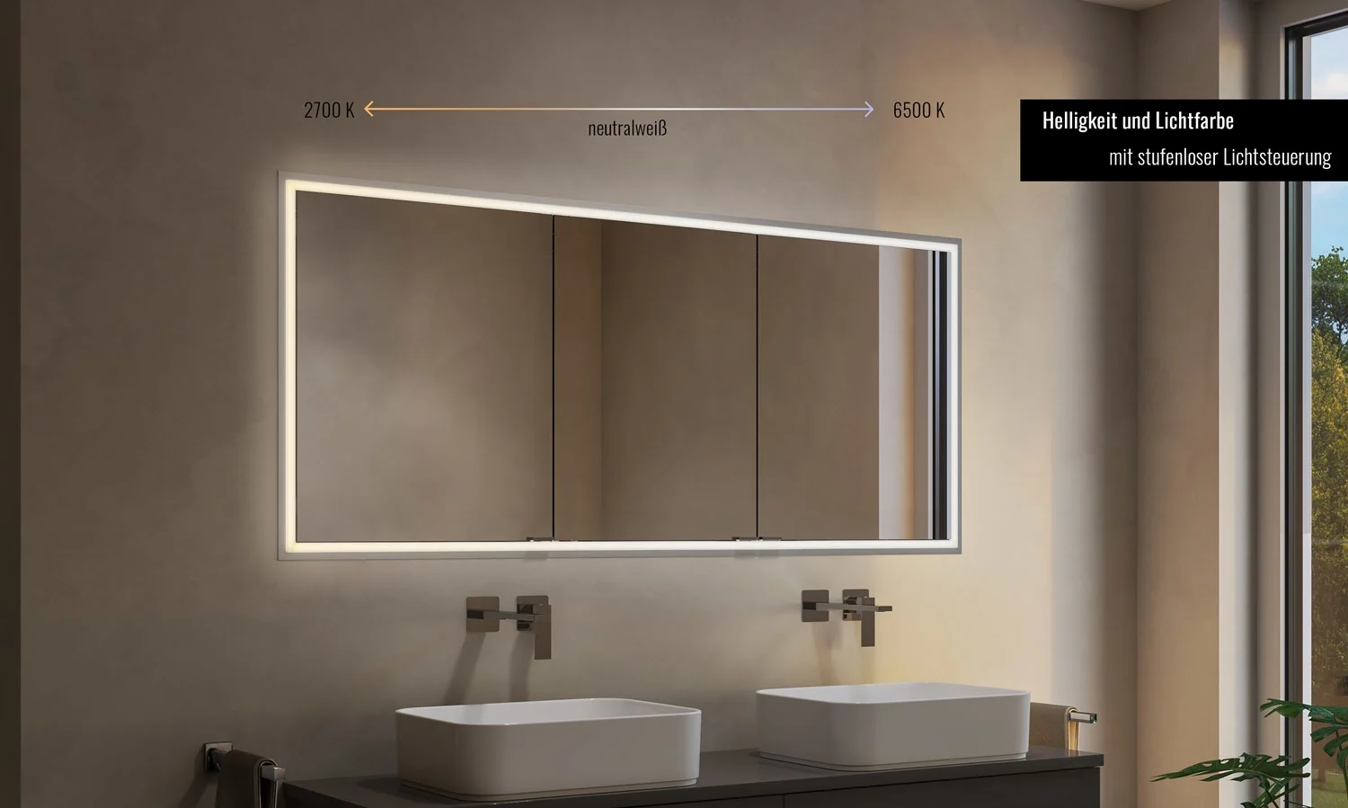 - stufenlose Lichtsteuerung an/aus, Helligkeit und Lichtfarbe über das Touch-Bedienfeld