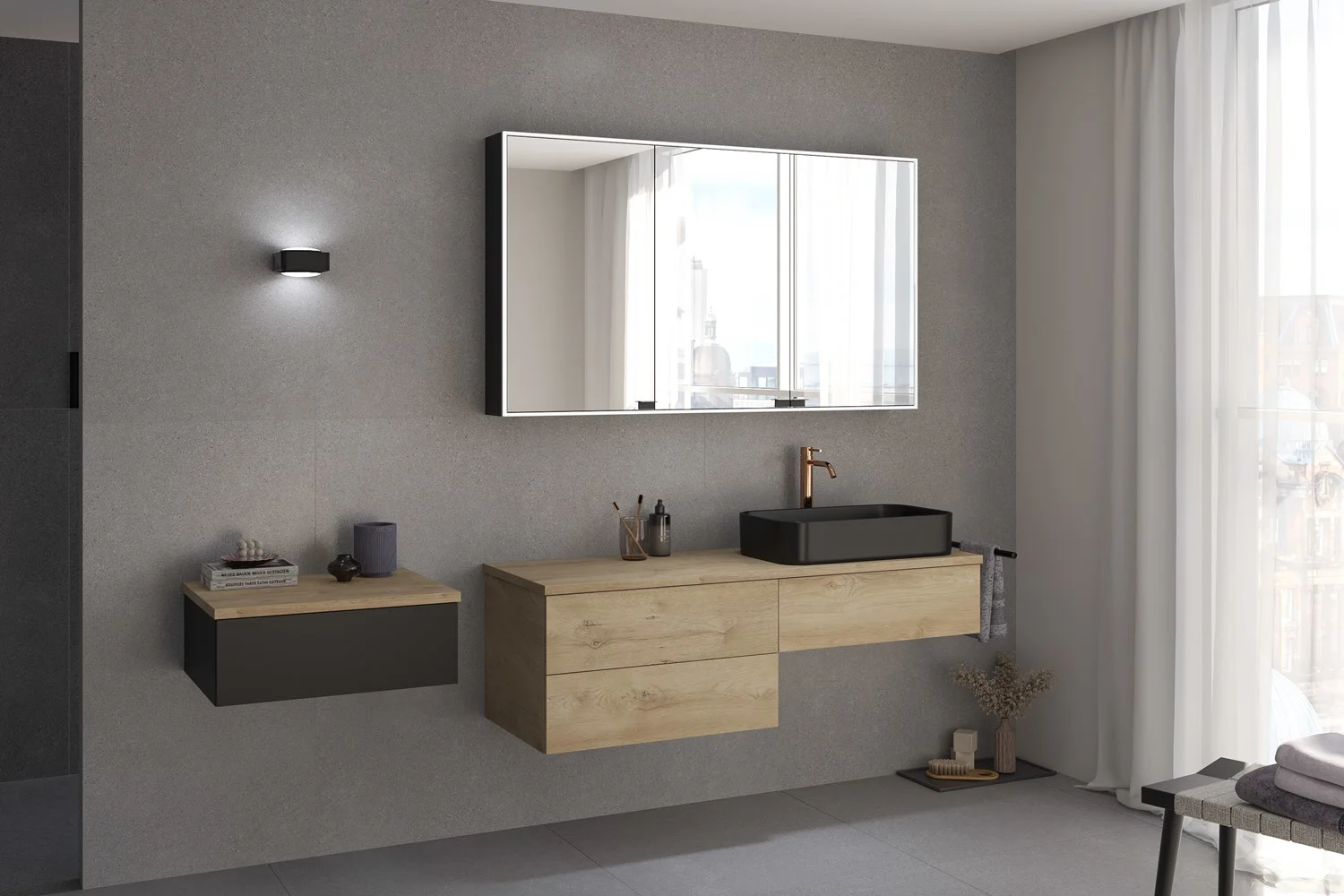 Der Korpuskern besteht aus einer Holzwerkstoffplatte. Die spezielle Melaminharzbeschichtung auf der Oberfläche bietet Schutz gegen Feuchtigkeit, Hitze und haushaltsübliche Beanspruchungen. Für eine dauerhafte Stabilität ist der Korpus mehrfach gedübelt. Die Waschtischplatte hat einen mehrschichtigen Aufbau. Dieser Schichtstoff ist härter, extrem widerstandsfähig, hygienisch, pflegeleicht, feuchtigkeitsunempfindlich und hält über Jahre selbst großen Alltagsbelastungen stand.
