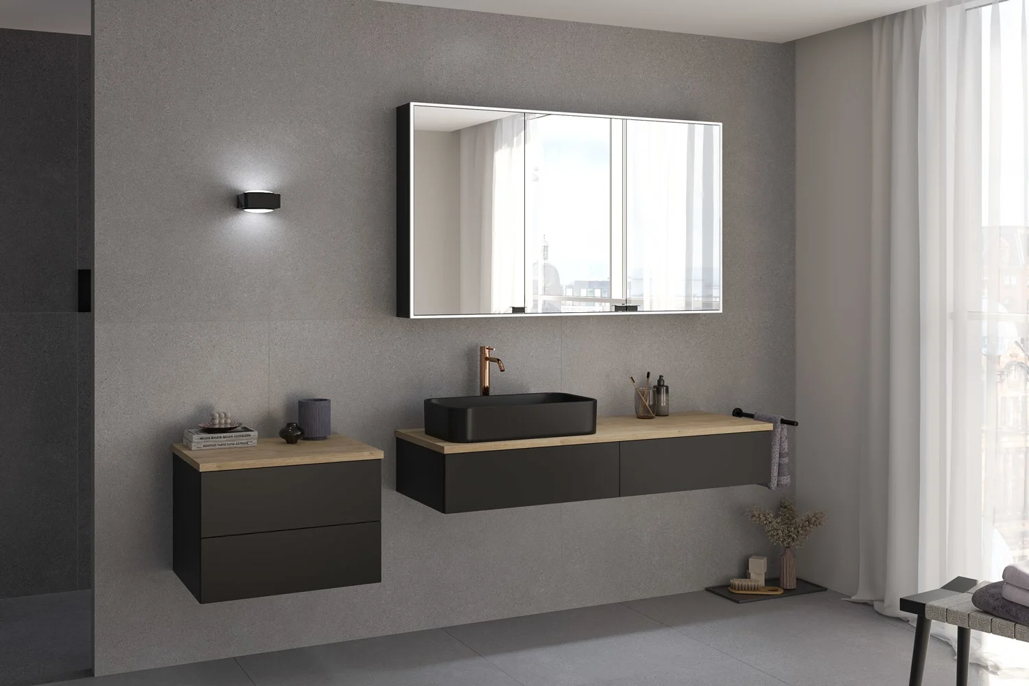 Der Korpuskern besteht aus einer Holzwerkstoffplatte. Die spezielle Melaminharzbeschichtung auf der Oberfläche bietet Schutz gegen Feuchtigkeit, Hitze und haushaltsübliche Beanspruchungen. Für eine dauerhafte Stabilität ist der Korpus mehrfach gedübelt. Die Waschtischplatte hat einen mehrschichtigen Aufbau. Dieser Schichtstoff ist härter, extrem widerstandsfähig, hygienisch, pflegeleicht, feuchtigkeitsunempfindlich und hält über Jahre selbst großen Alltagsbelastungen stand.