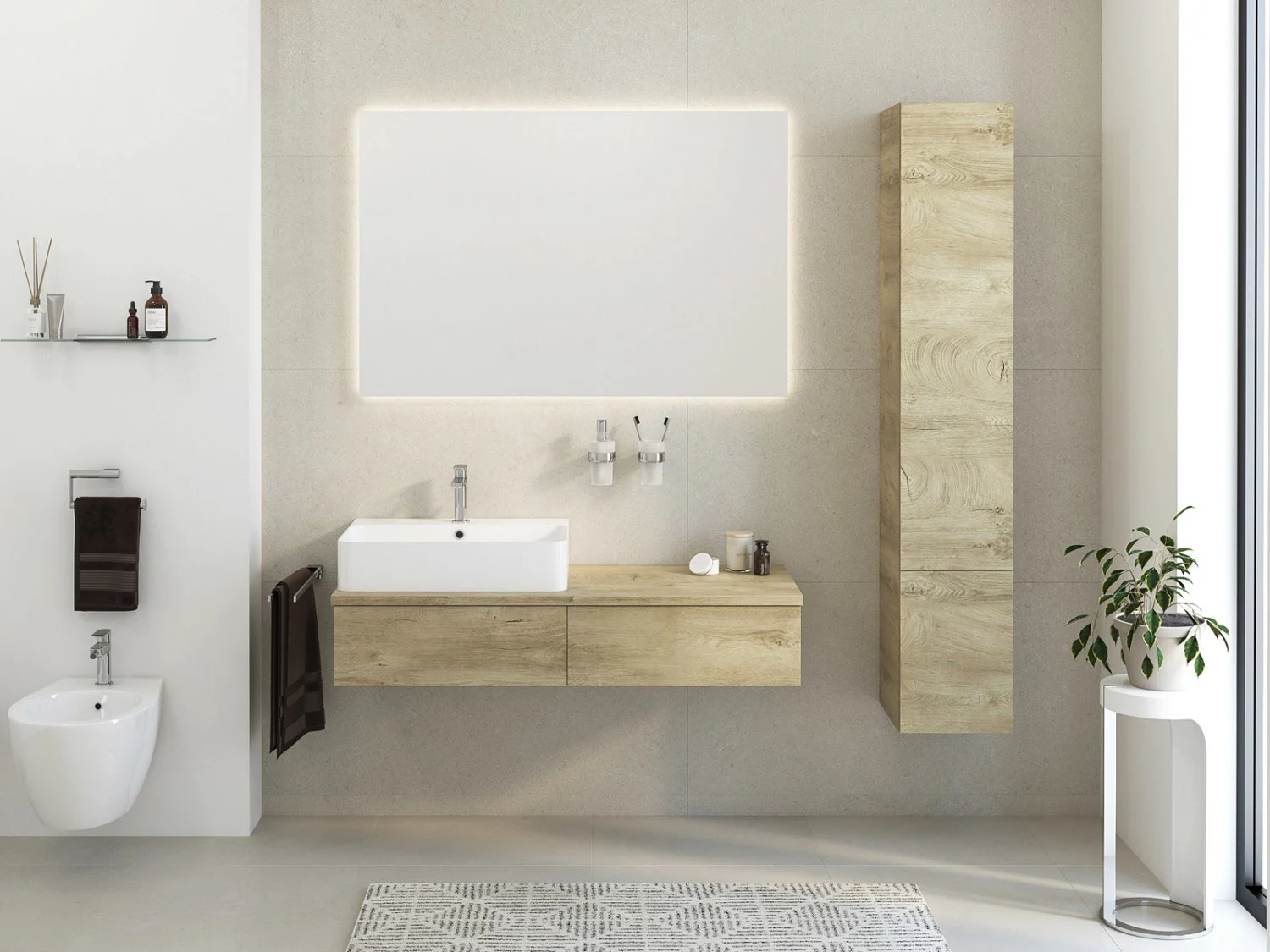 Der Korpuskern besteht aus einer Holzwerkstoffplatte. Die spezielle Melaminharzbeschichtung auf der Oberfläche bietet Schutz gegen Feuchtigkeit, Hitze und haushaltsübliche Beanspruchungen. Für eine dauerhafte Stabilität ist der Korpus mehrfach gedübelt. Die Waschtischplatte hat einen mehrschichtigen Aufbau. Dieser Schichtstoff ist härter, extrem widerstandsfähig, hygienisch, pflegeleicht, feuchtigkeitsunempfindlich und hält über Jahre selbst großen Alltagsbelastungen stand.