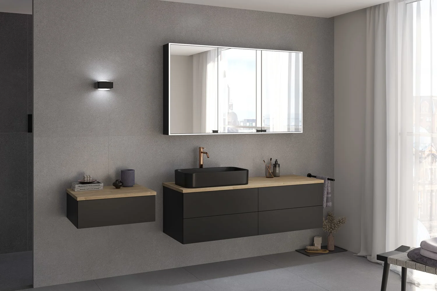 Die Innenausstattung ist grundsätzlich gedämpft und beinhaltet Blum ANTARO-Schubkästen sowie Auszüge in oriongrau als Vollauszüge mit farblich abgestimmtem Kosmetikeinsatz.