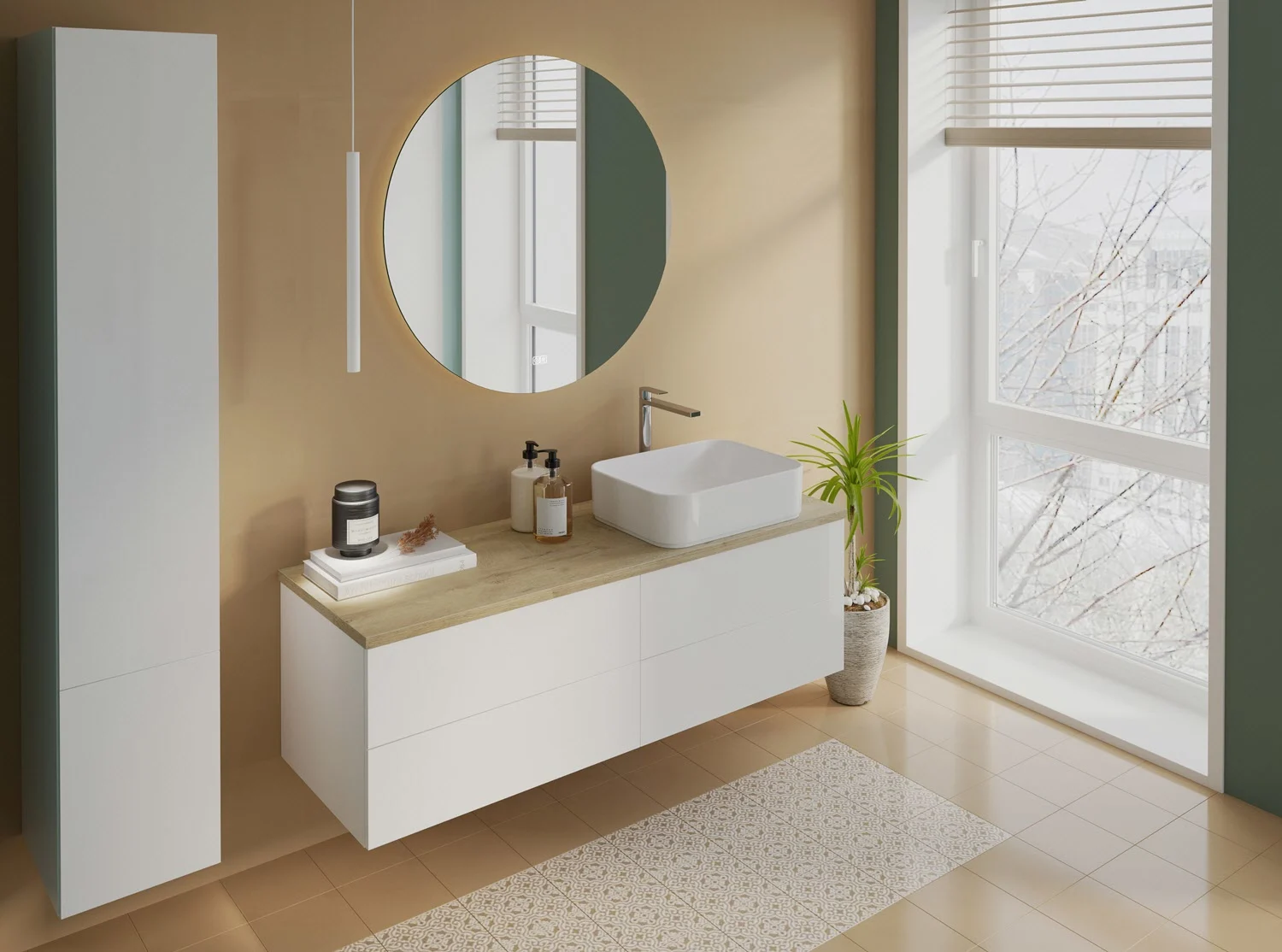 Der Korpuskern besteht aus einer Holzwerkstoffplatte. Die spezielle Melaminharzbeschichtung auf der Oberfläche bietet Schutz gegen Feuchtigkeit, Hitze und haushaltsübliche Beanspruchungen. Für eine dauerhafte Stabilität ist der Korpus mehrfach gedübelt. Die Waschtischplatte hat einen mehrschichtigen Aufbau. Dieser Schichtstoff ist härter, extrem widerstandsfähig, hygienisch, pflegeleicht, feuchtigkeitsunempfindlich und hält über Jahre selbst großen Alltagsbelastungen stand.