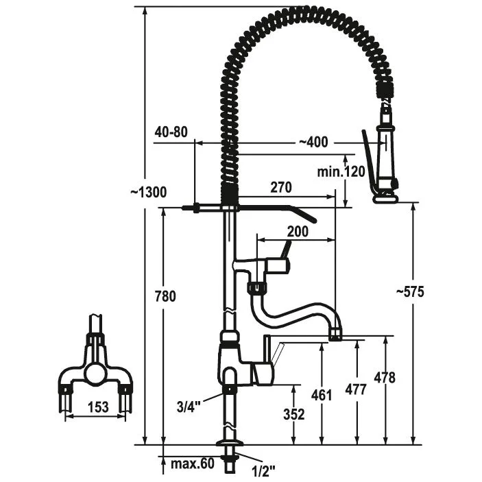 KWC Gastro Einhebel Spültisch-Zweiloch-Brückenbatterie mit erhöhtem Sockel, Ausladung 20 cm