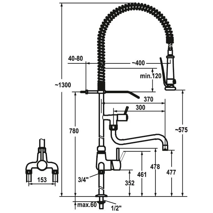KWC Gastro Einhebel Spültisch-Zweiloch-Brückenbatterie mit erhöhtem Sockel, Ausladung 30 cm