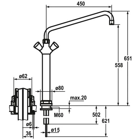 KWC Gastro Zweigriff-Spültischbatterie mit hohem Sockel für die Profiküche, Höhe 65,1 cm