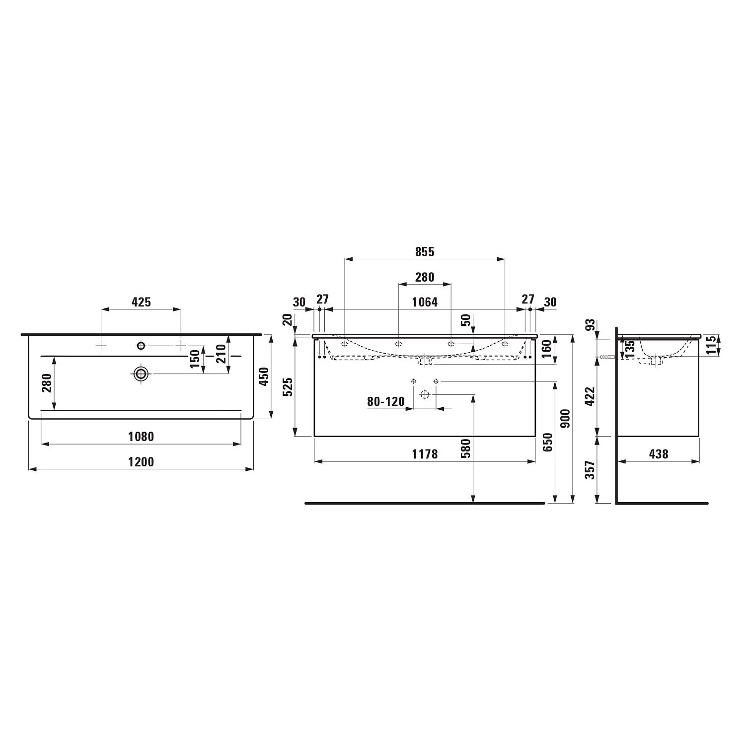 LAUFEN Palace Waschtischkombination 120 cm mit Griffleiste schwarz und 2 Hahnlöcher