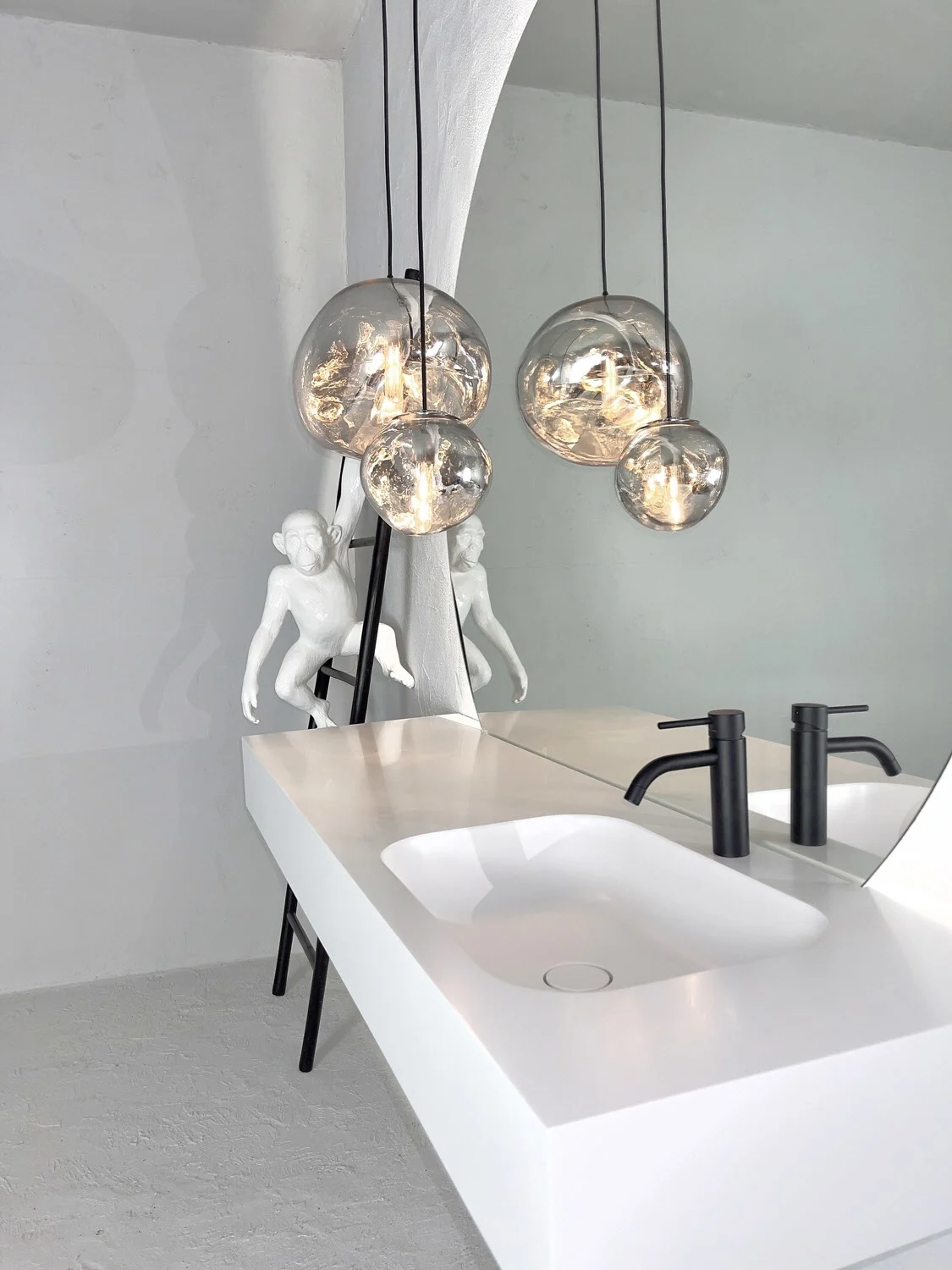 pianura Emilia Badmöbel Set 160 cm mit LED-Lichtspiegel und Hängeleuchten, Becken rechts